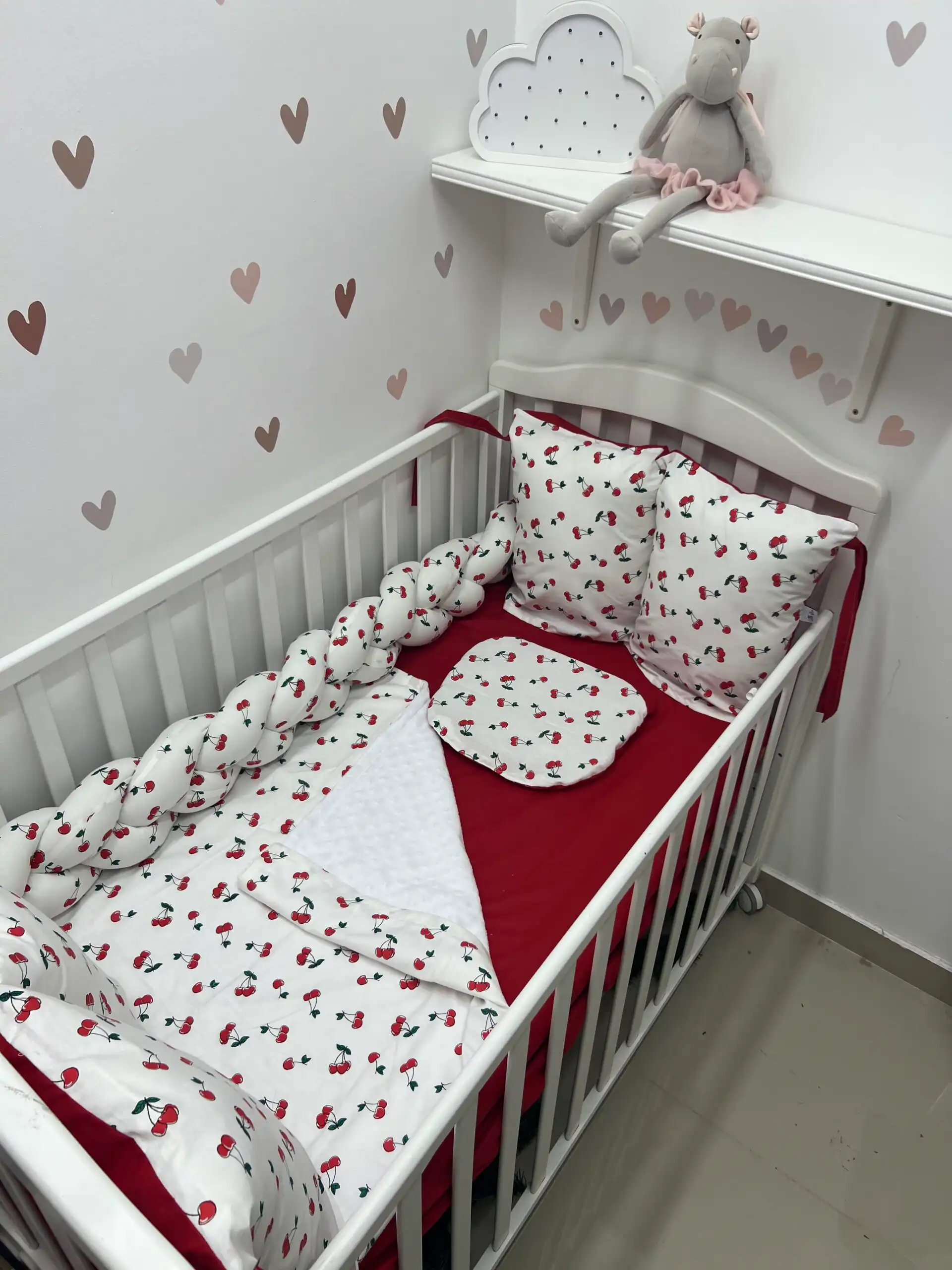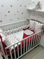 Set sadrži sve što vam je potrebno: navlaku za dušek sa lastišem (ili dušek-čaršaf), ravno jastuče, prekrivač, pletenicu dužine 120 cm za dužu stranu krevetca i jastučiće sa vezicama za bočne strane, sa skidajućim navlakama radi lakšeg održavanja. Kombinacija tekstura, pastelnih boja i praktičnih detalja čini ovaj set savršenim za svakodnevnu upotrebu, ali i kao poseban poklon. 🎀