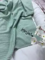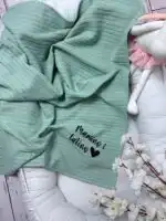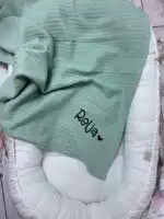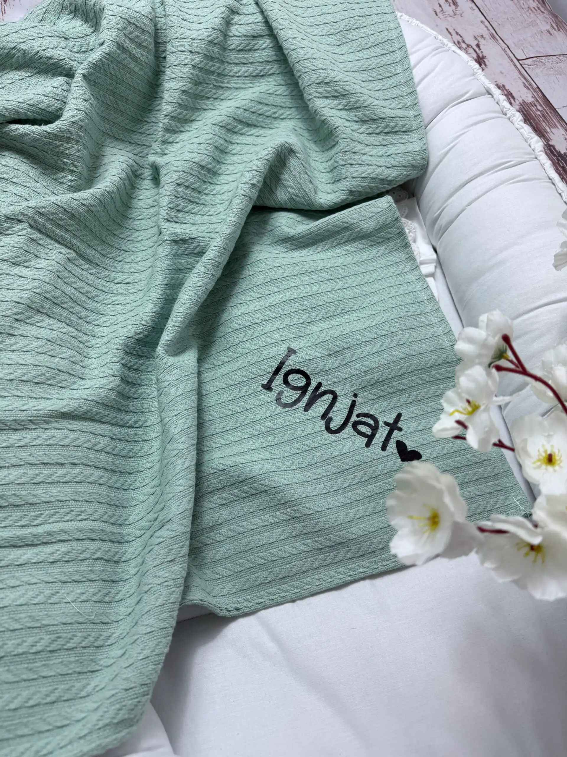 Mekan i lagan prekrivač od pamučne pletenine, idealan za šetnje, krevetac ili kao nežan poklon sa ličnim pečatom.