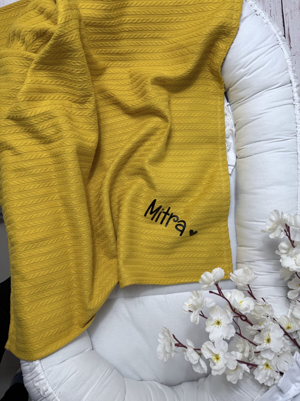 Mekan i lagan prekrivač od pamučne pletenine, idealan za šetnje, krevetac ili kao nežan poklon sa ličnim pečatom.