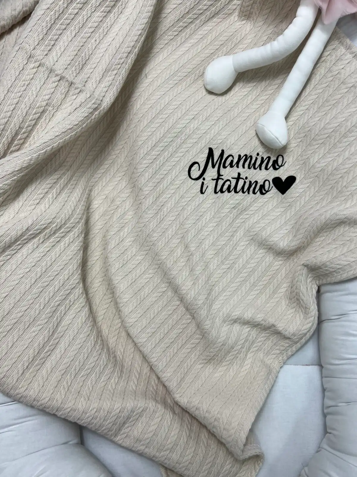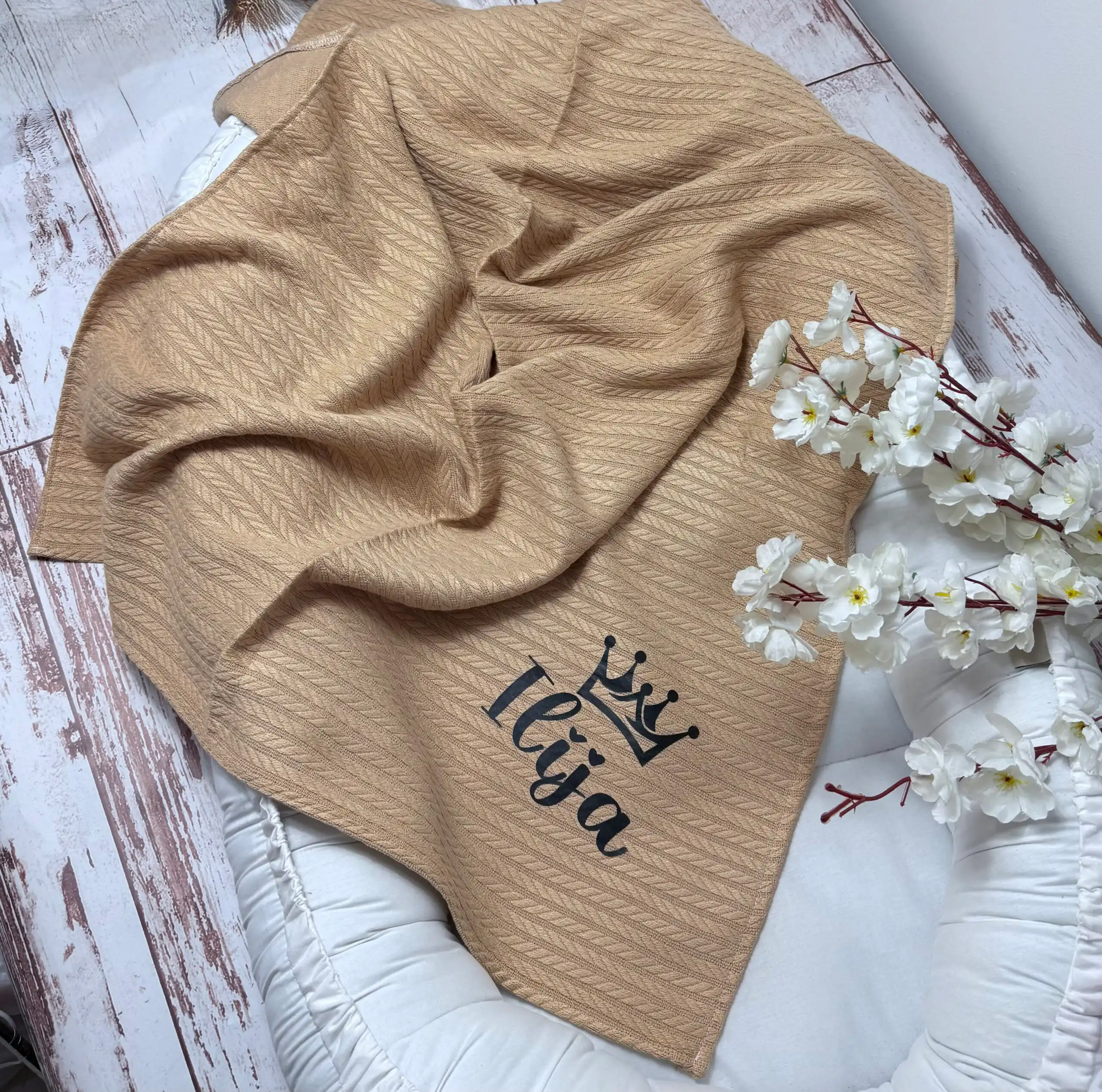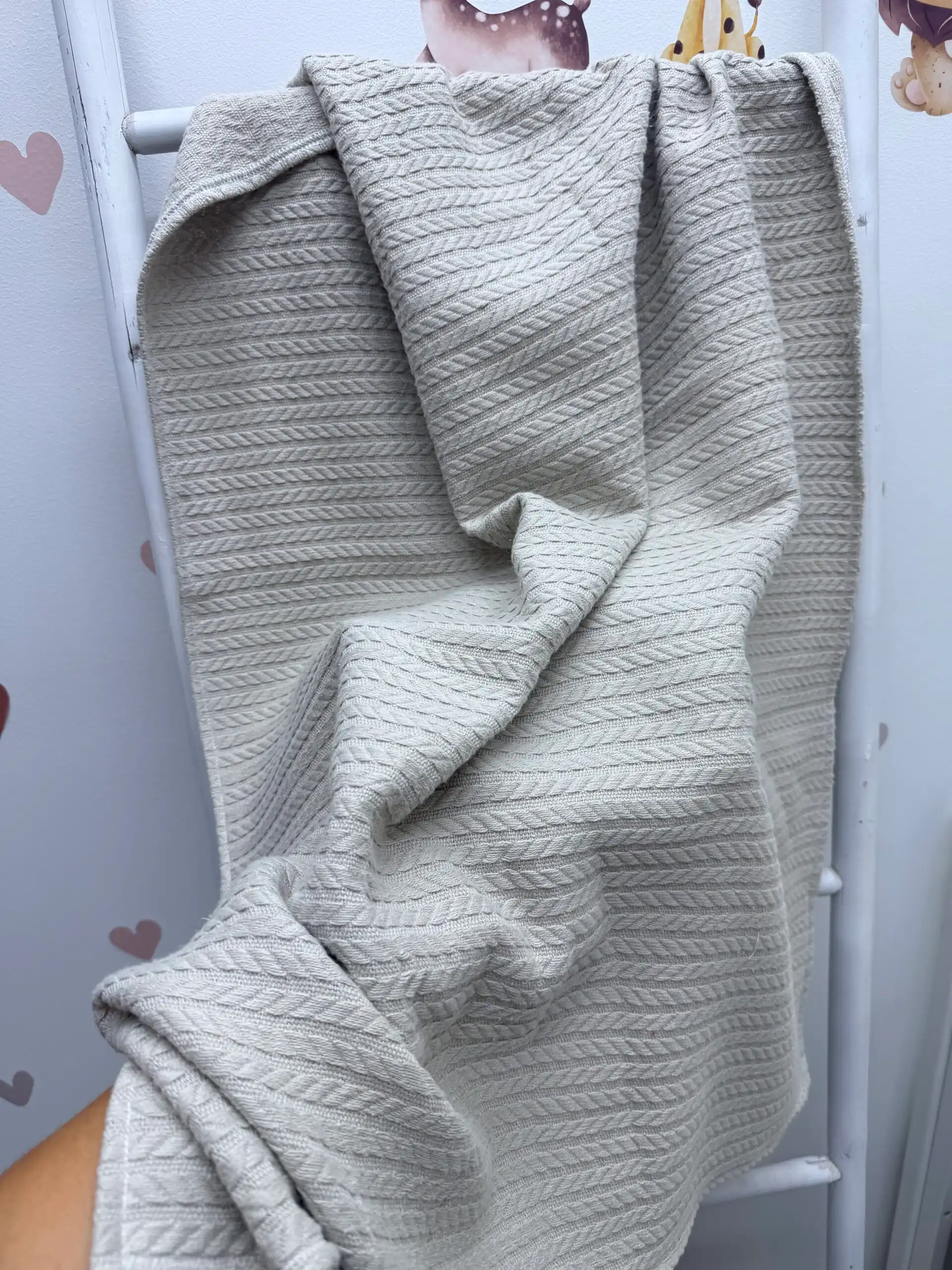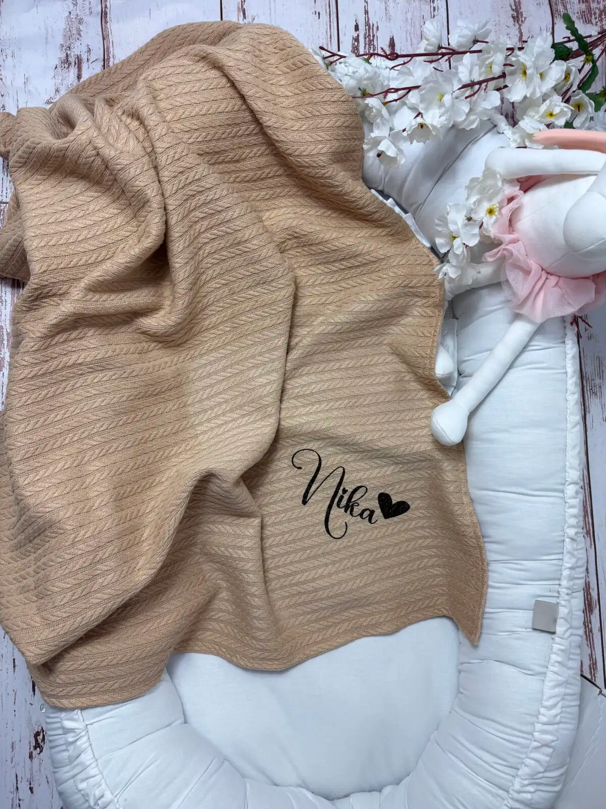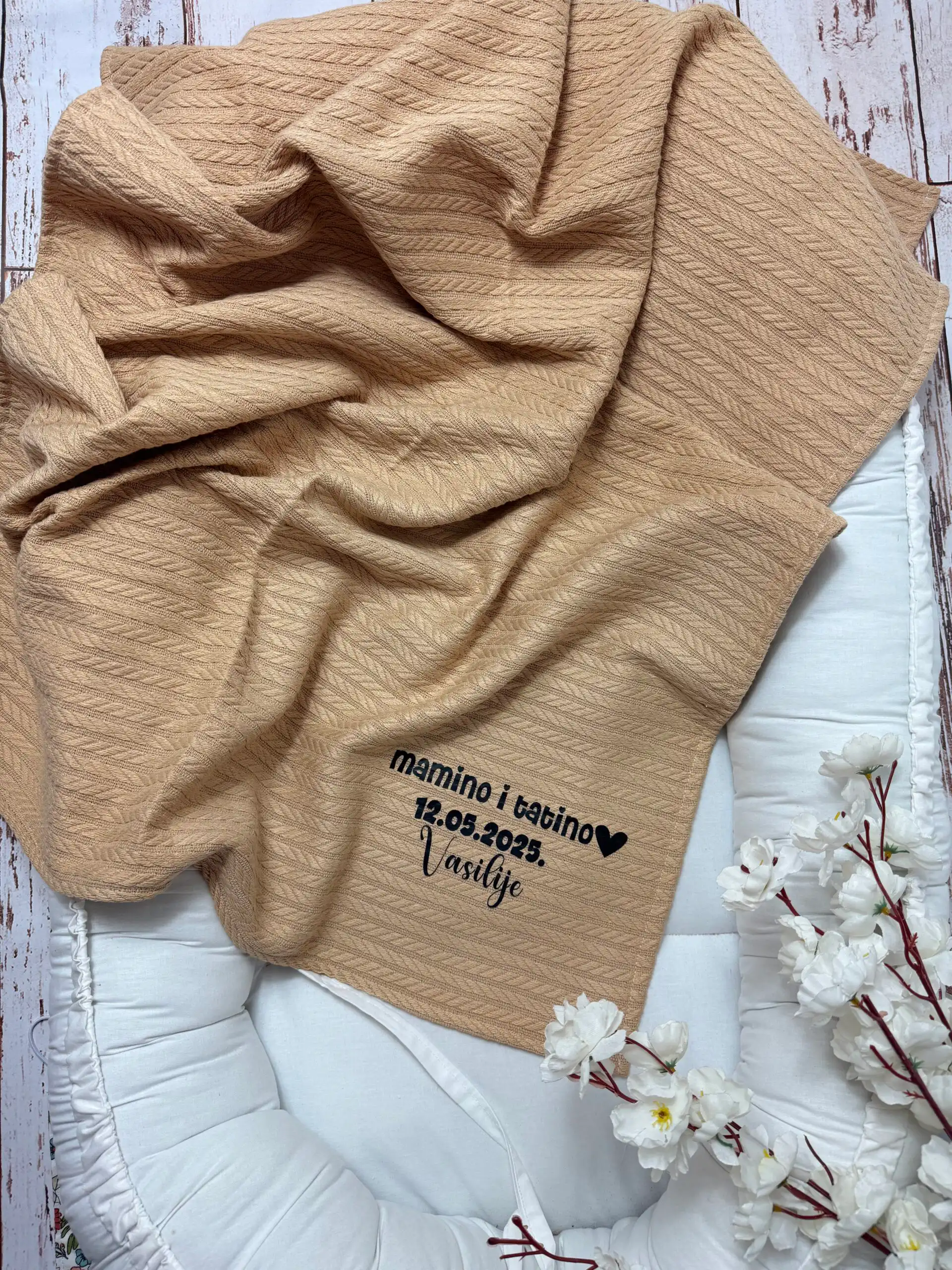 Mekan i lagan prekrivač od pamučne pletenine, idealan za šetnje, krevetac ili kao nežan poklon sa ličnim pečatom.