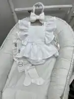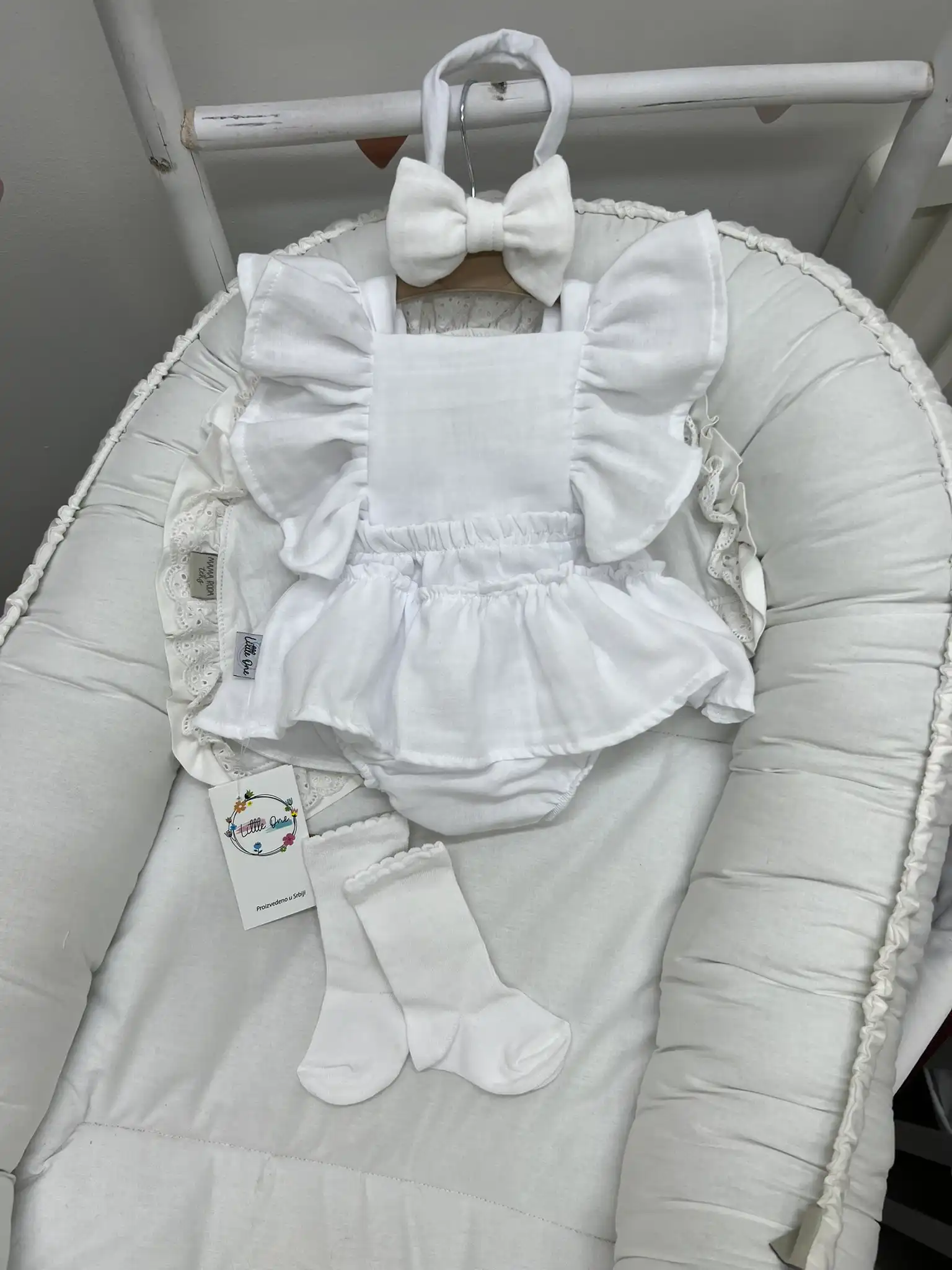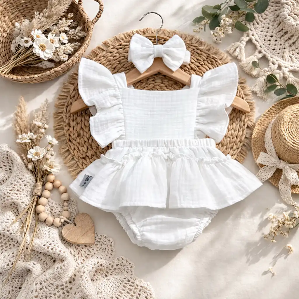 Lagani muslin romper izrađen od nežnog, prozračnog pamuka – savršen za tople dane i osetljivu bebinu kožu. Udoban, praktičan i idealan za svakodnevne avanture i posebne prilike. Po želji, može se personalizovati natpisom koji ovu odevnu kombinaciju čini još posebnijom i jedinstvenom. Dolazi u setu sa nežnom trakicom za kosu.