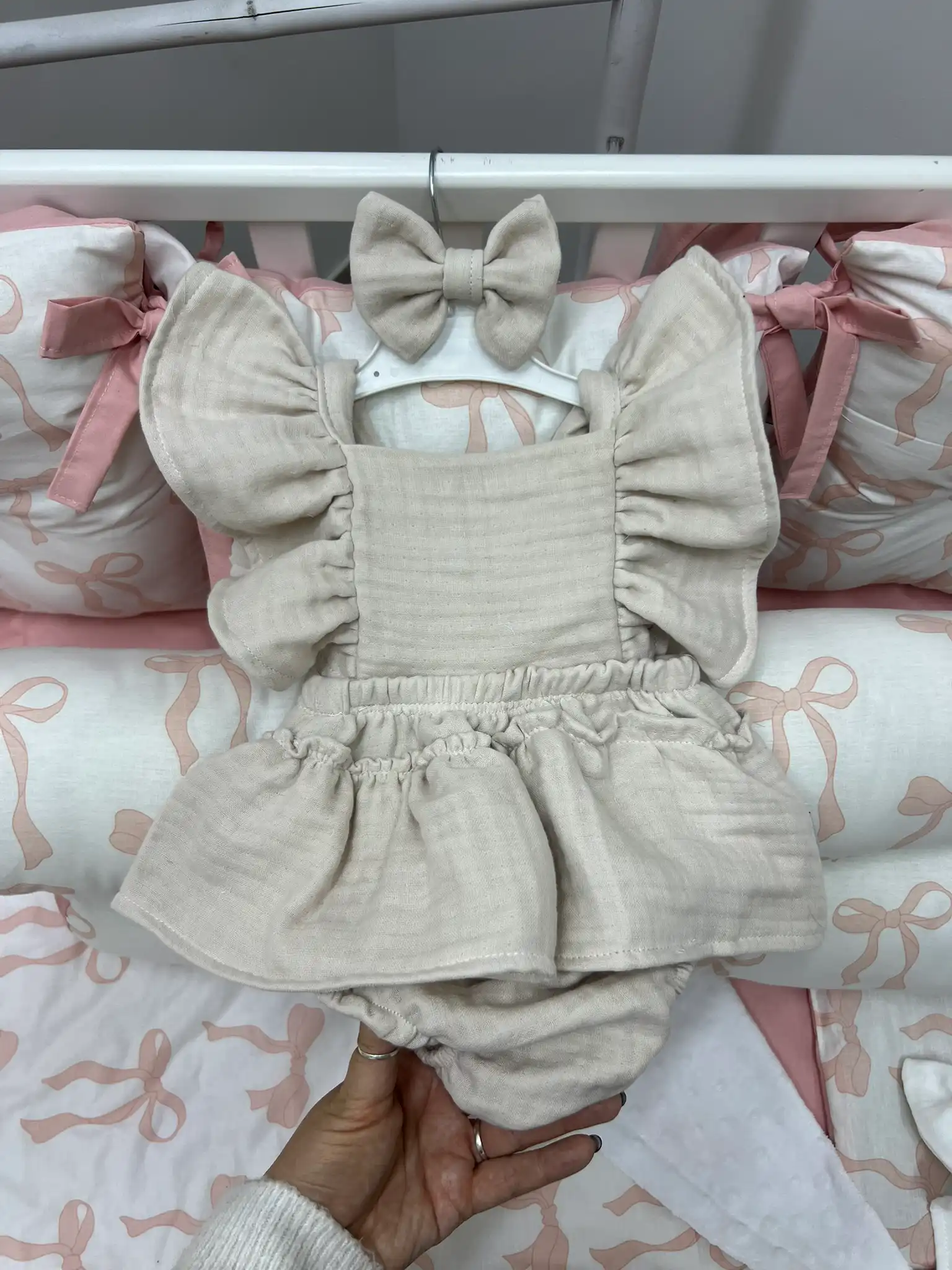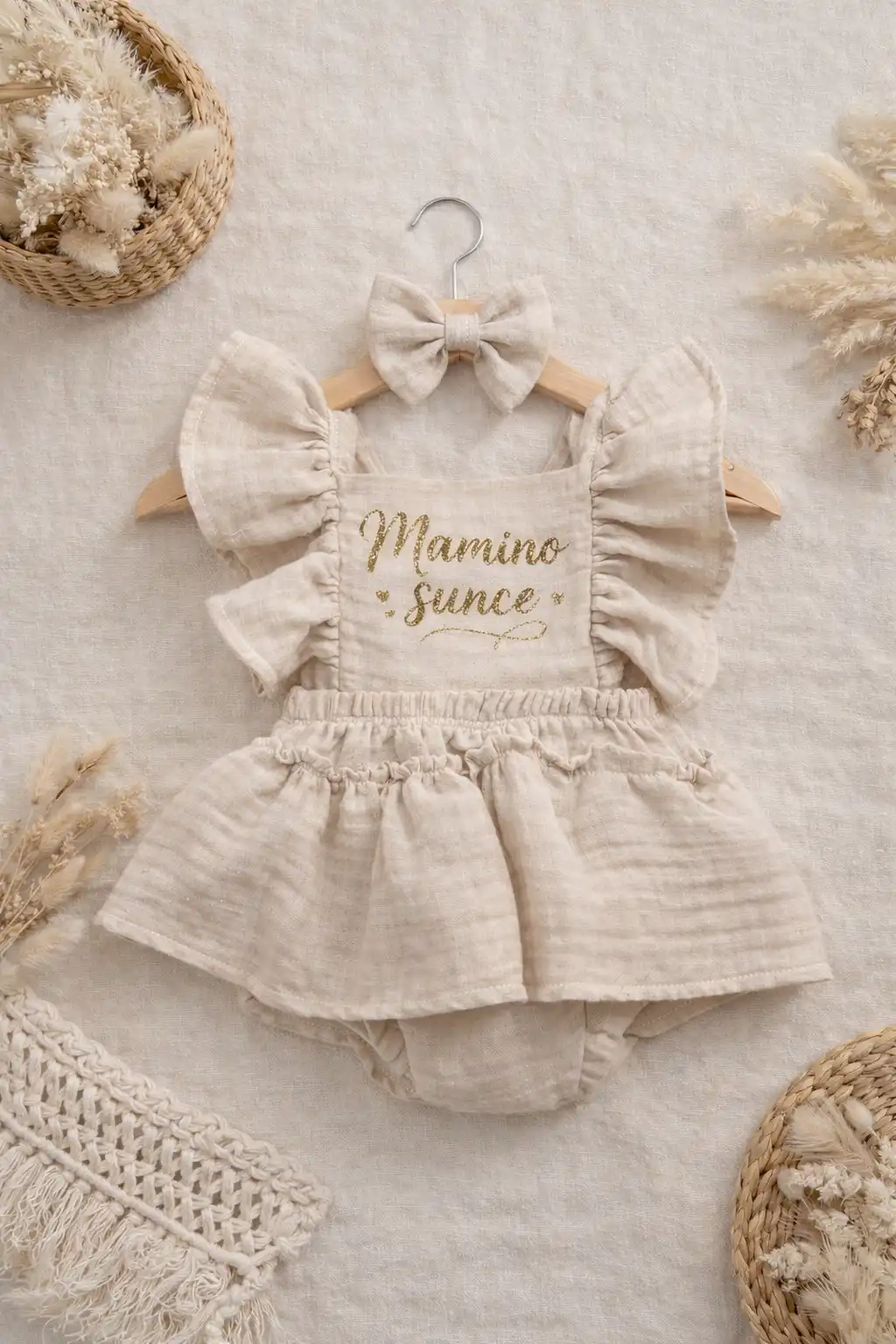 Lagani muslin romper izrađen od nežnog, prozračnog pamuka – savršen za tople dane i osetljivu bebinu kožu. Udoban, praktičan i idealan za svakodnevne avanture i posebne prilike. Po želji, može se personalizovati natpisom koji ovu odevnu kombinaciju čini još posebnijom i jedinstvenom. Dolazi u setu sa nežnom trakicom za kosu.
