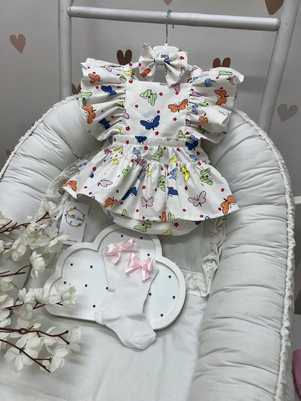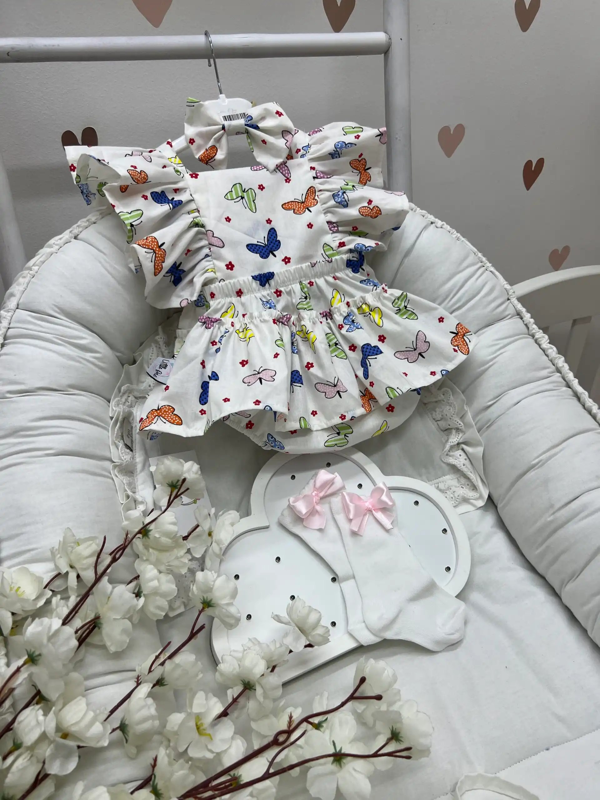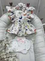 Zašto kažem romper, a ne haljinica? Ledja su pozadi otvorena, tregeri sa raskošnim karnerima, su podesivi, te je predvidjeno da jednu velicinu beba nosi duže. Da Vam objasnim, šijemo ga u tri takoreći velicine: