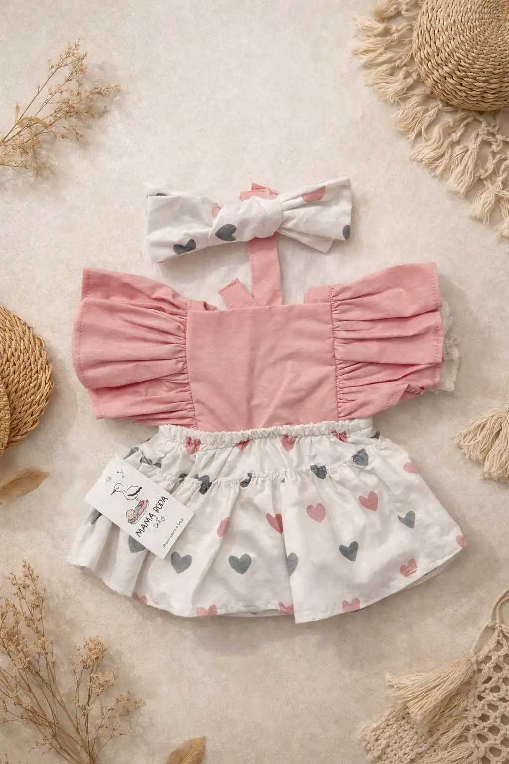 Zašto kažem romper, a ne haljinica? Ledja su pozadi otvorena, tregeri sa raskošnim karnerima, su podesivi, te je predvidjeno da jednu velicinu beba nosi duže. Da Vam objasnim, šijemo ga u tri takoreći velicine: