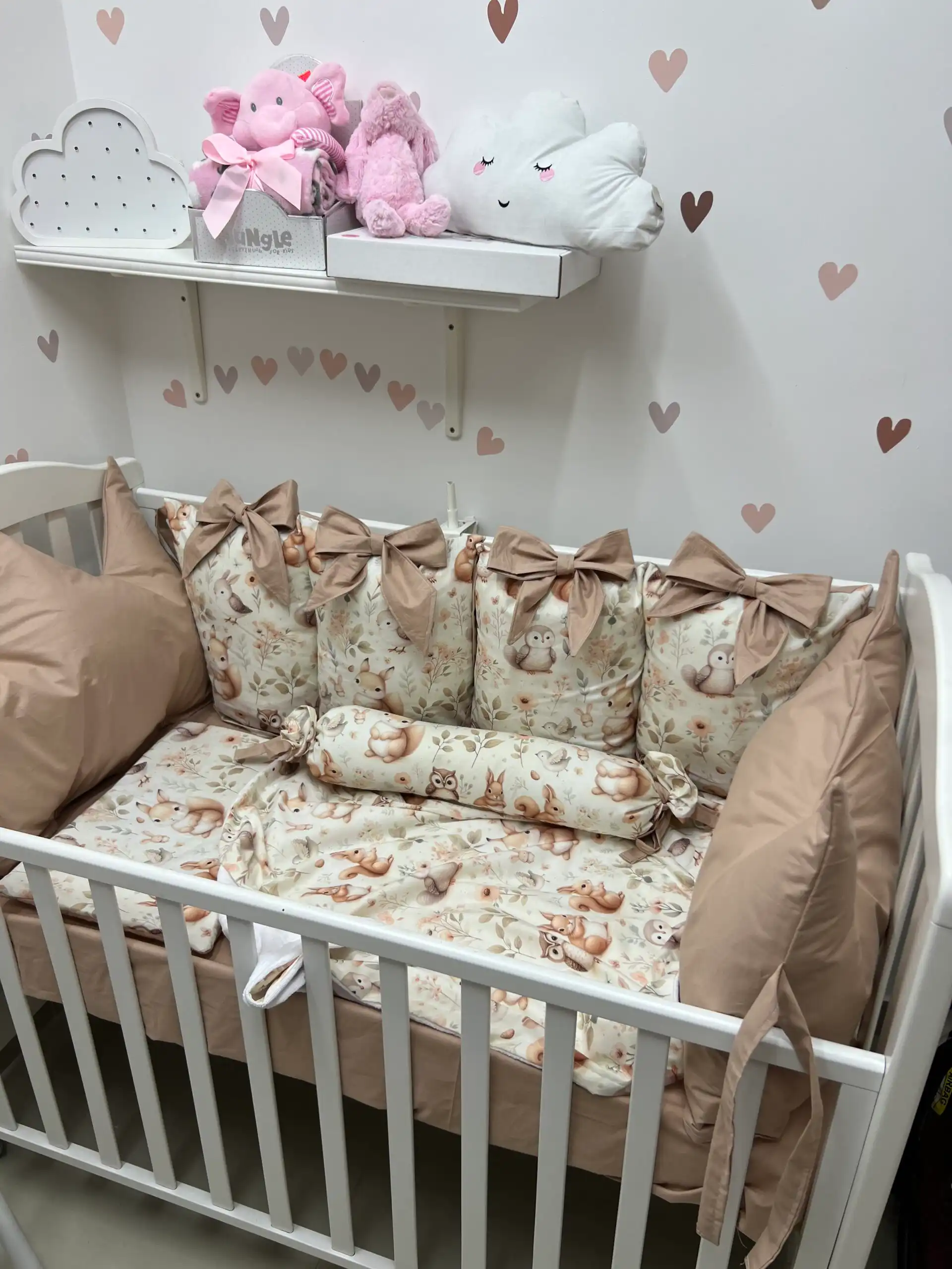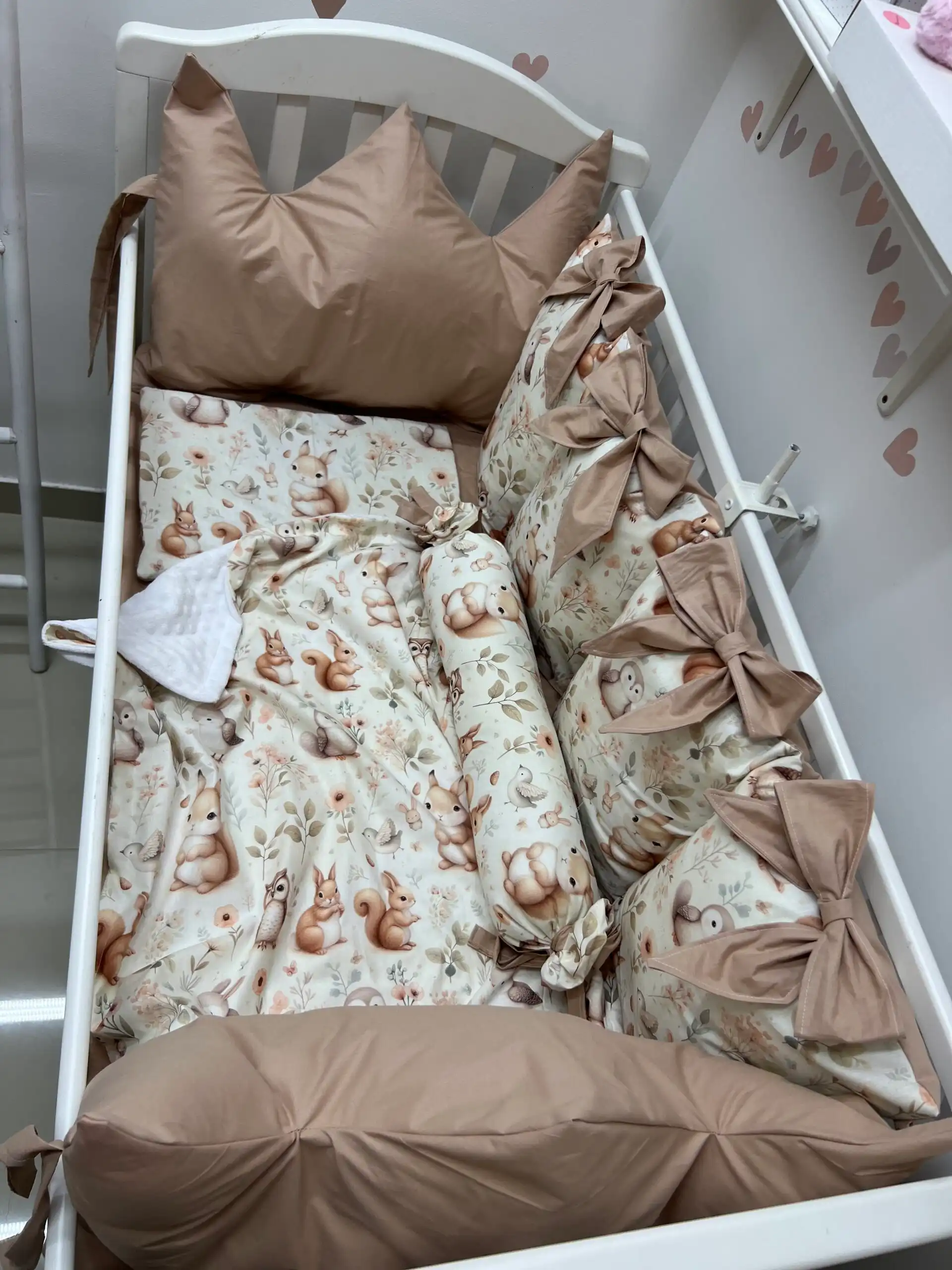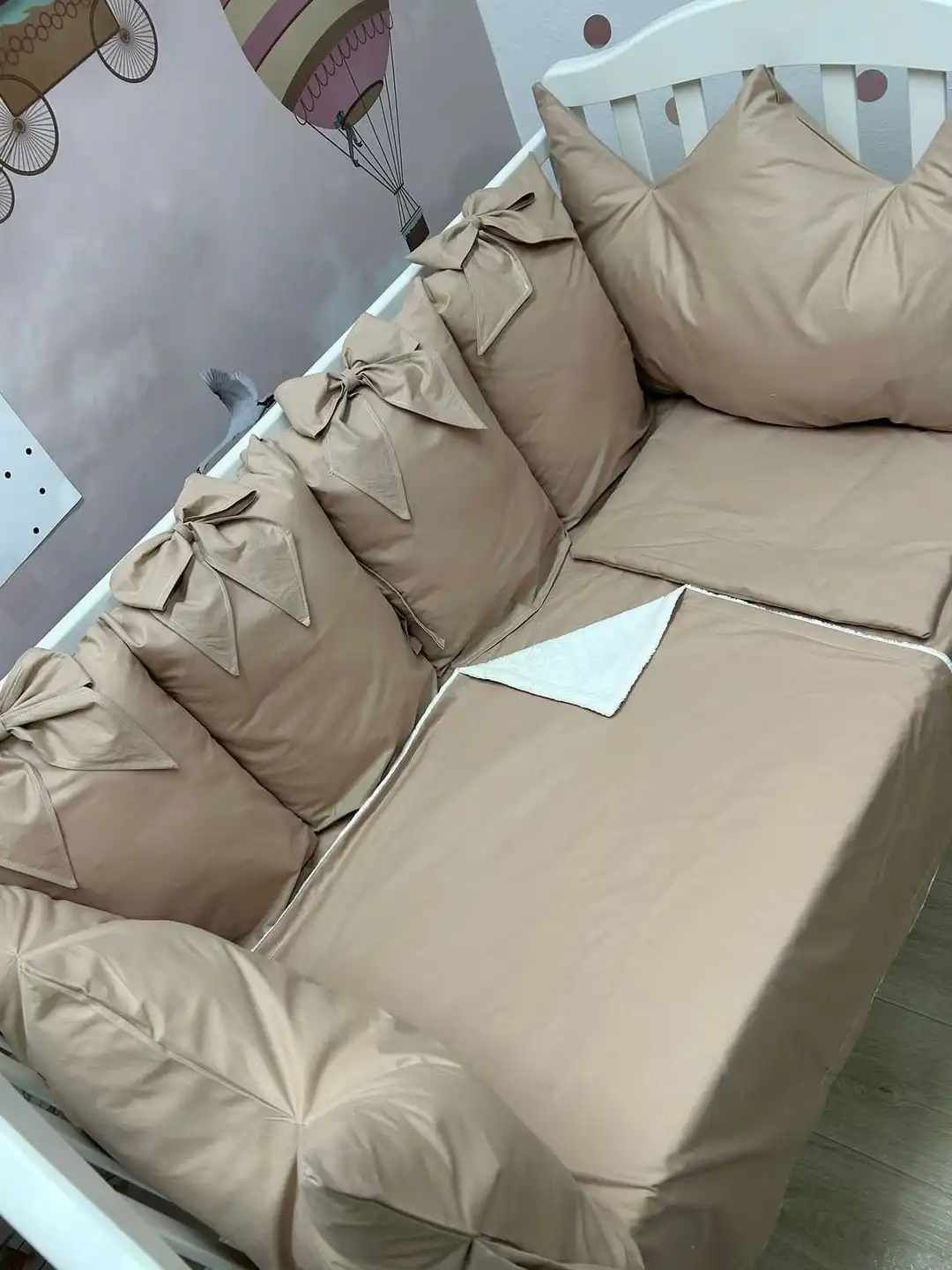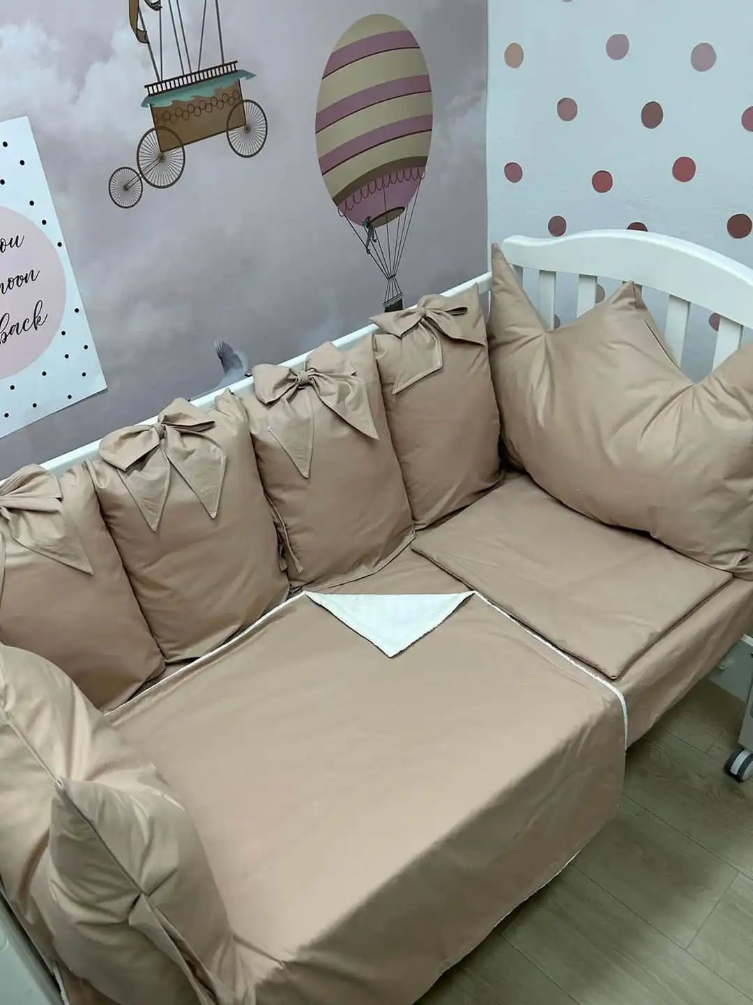 Jastuci za tri strane, sa vezicama pomoću kojih se pričvršćuju za krevetac, imaju navlake koje se skidaju, kao i mašne. Uz to dolaze dušek, čaršav sa lastišem, prekrivač i ravni jastuk.