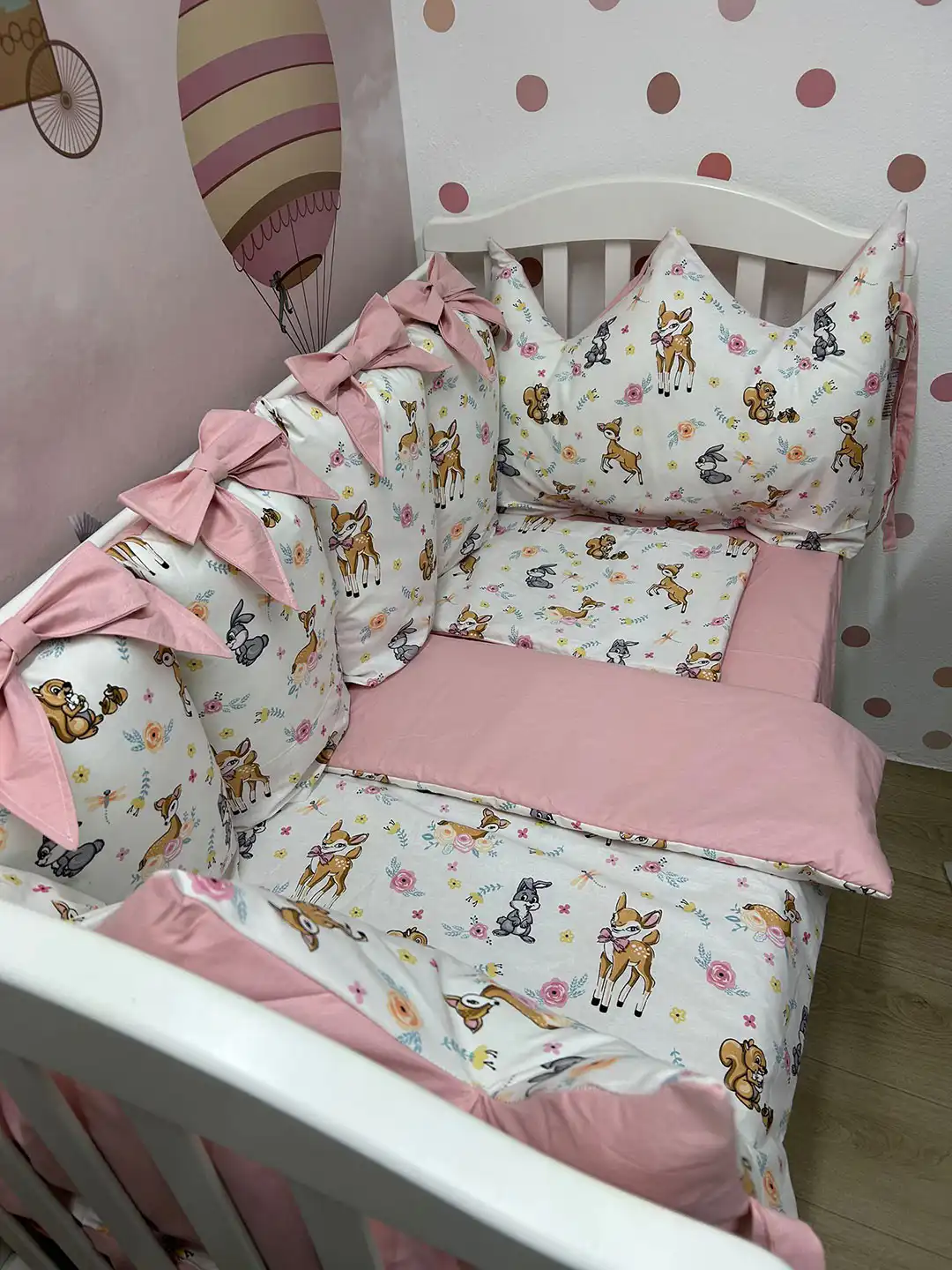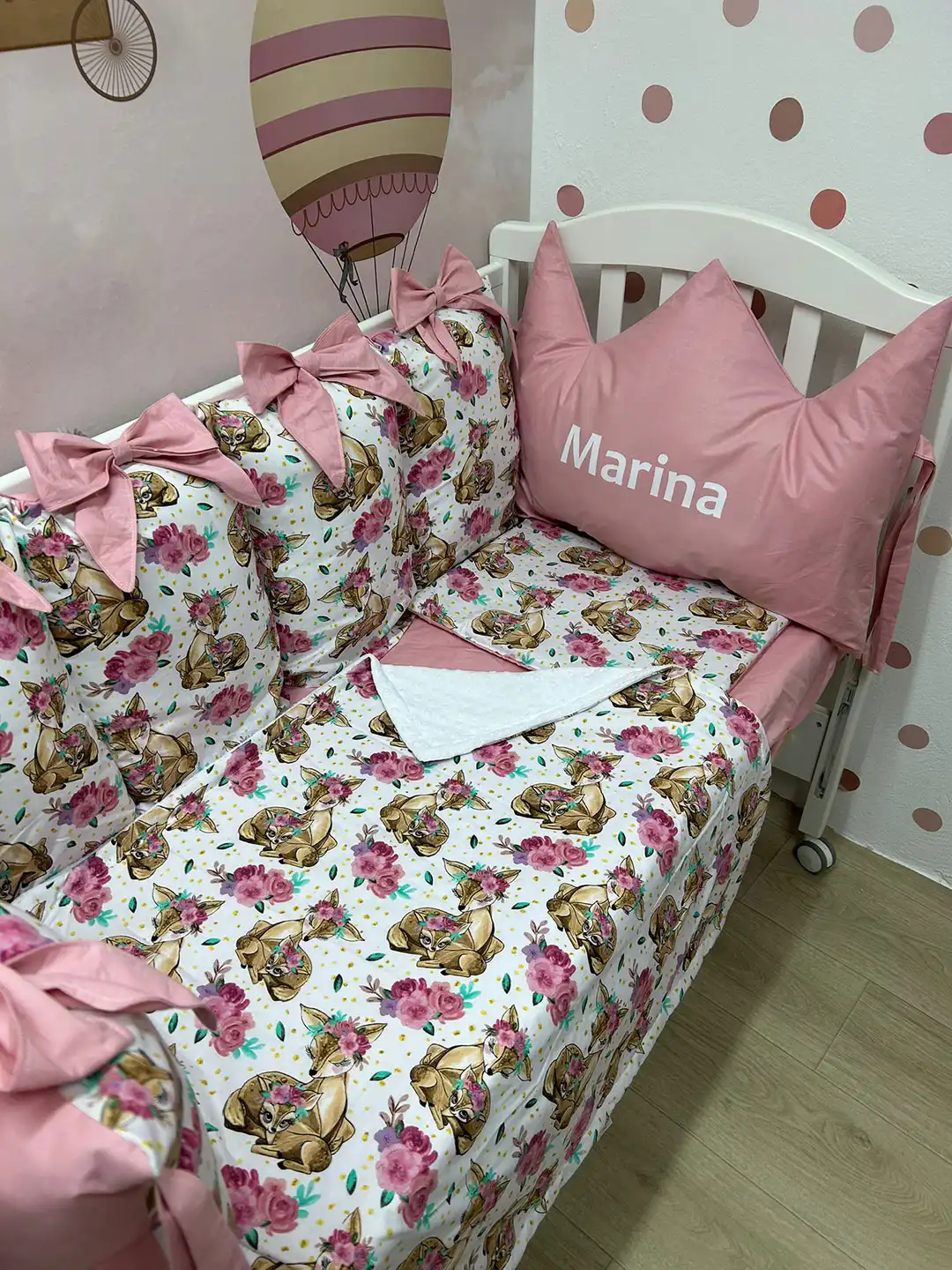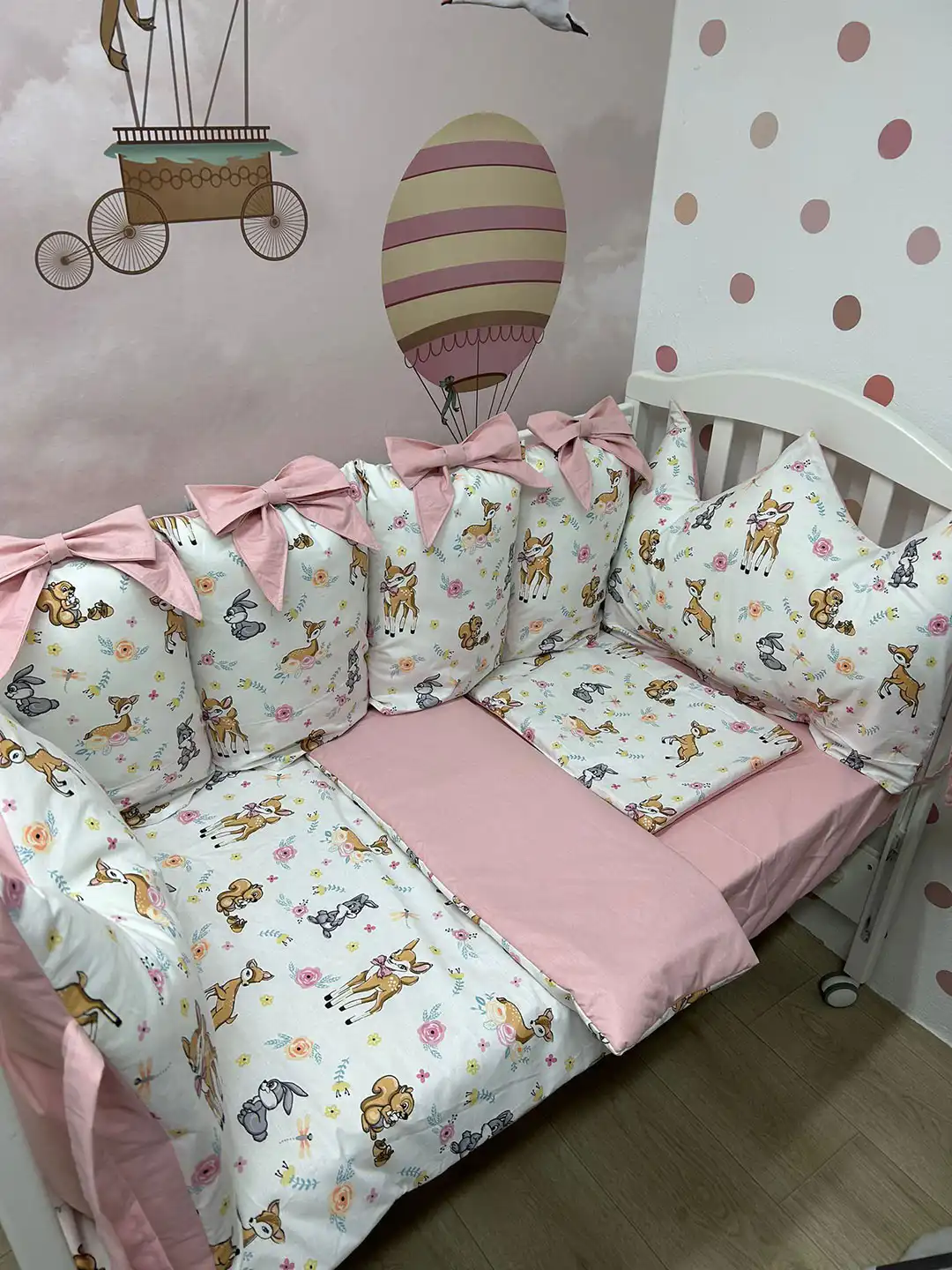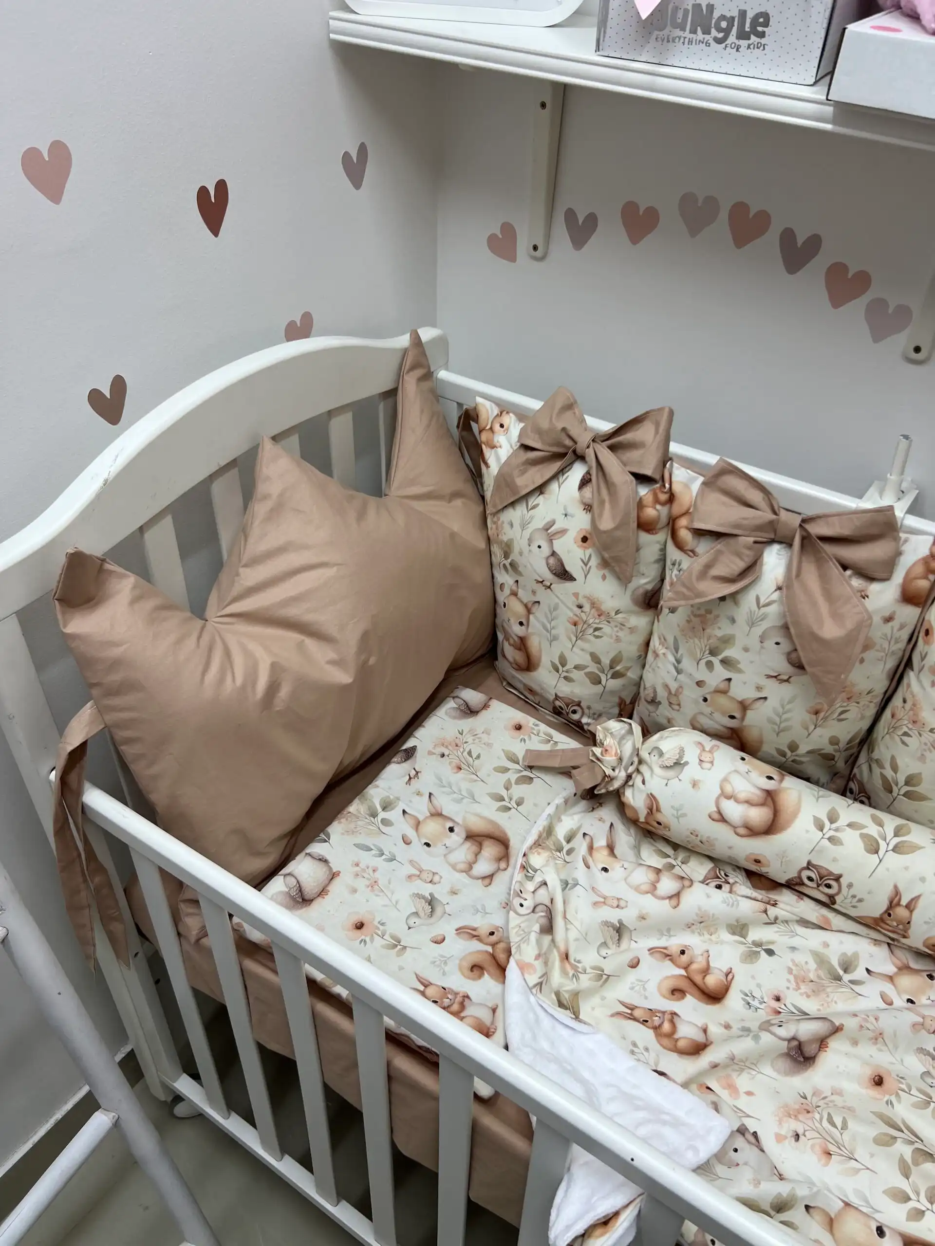 Jastuci za tri strane, sa vezicama pomoću kojih se pričvršćuju za krevetac, imaju navlake koje se skidaju, kao i mašne. Uz to dolaze dušek, čaršav sa lastišem, prekrivač i ravni jastuk.