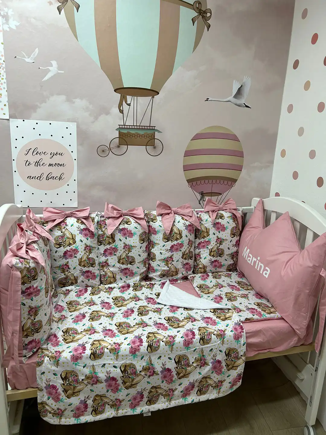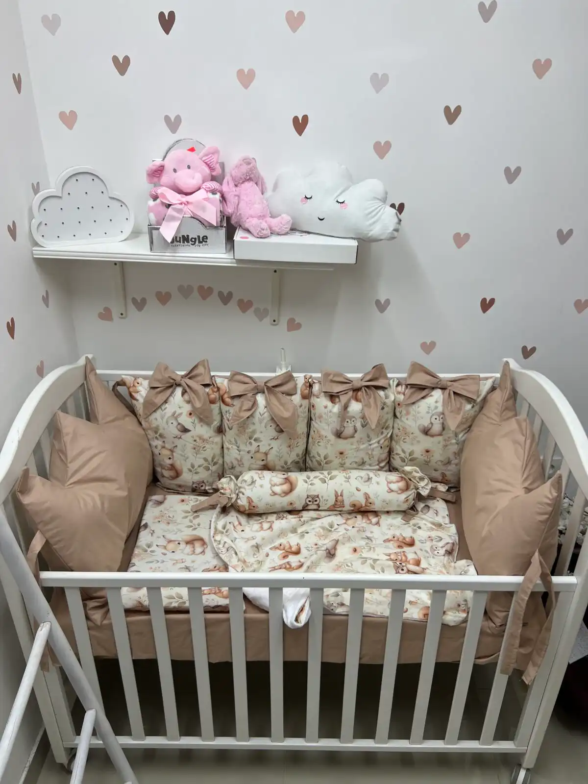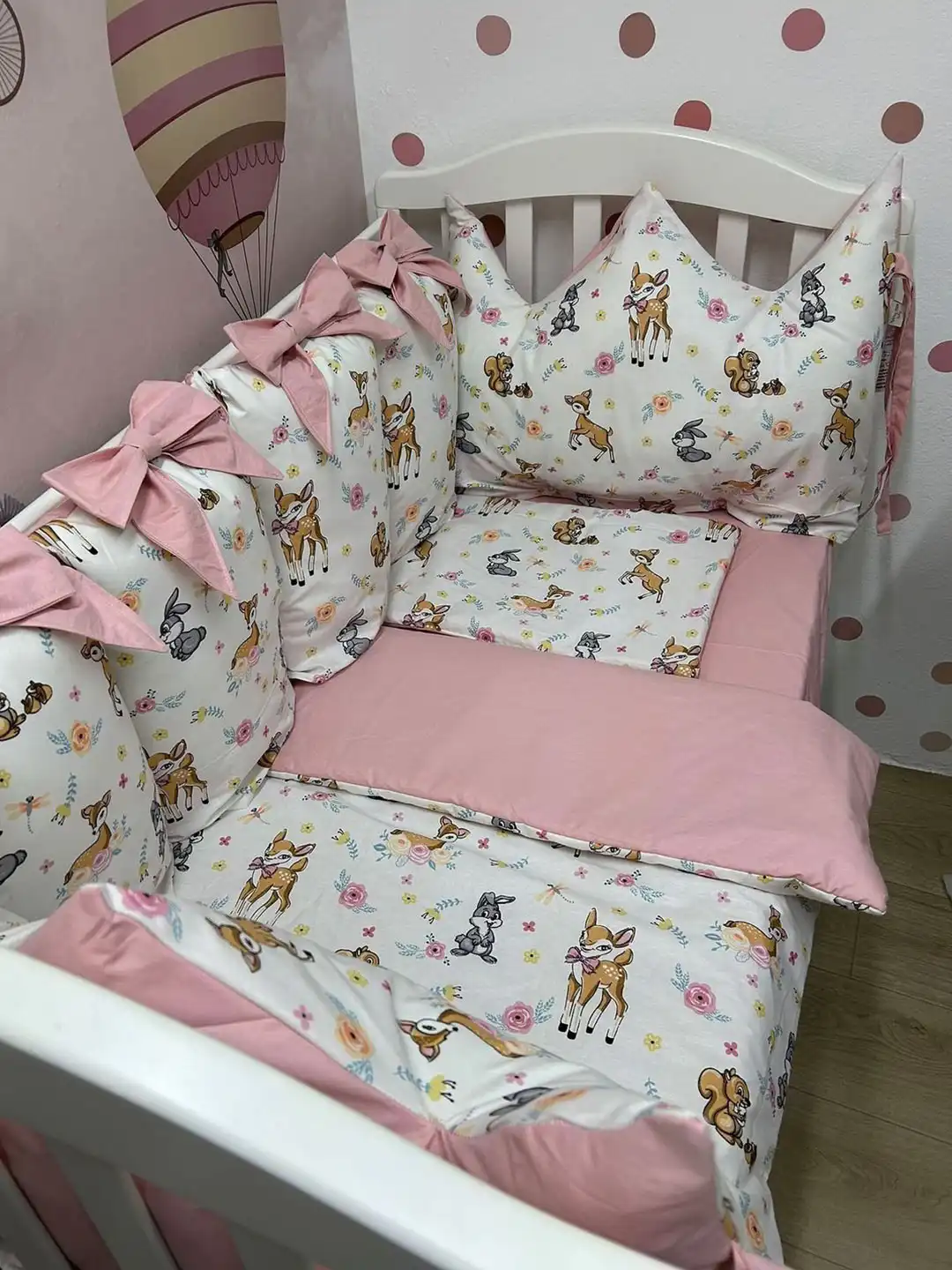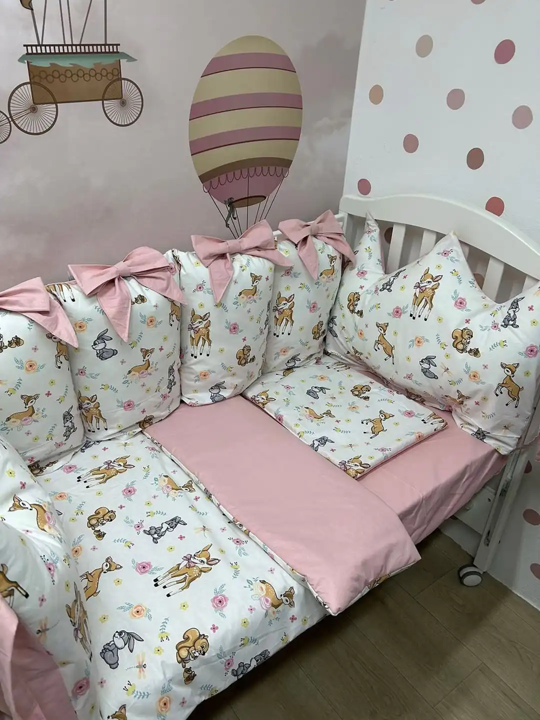 Jastuci za tri strane, sa vezicama pomoću kojih se pričvršćuju za krevetac, imaju navlake koje se skidaju, kao i mašne. Uz to dolaze dušek, čaršav sa lastišem, prekrivač i ravni jastuk.