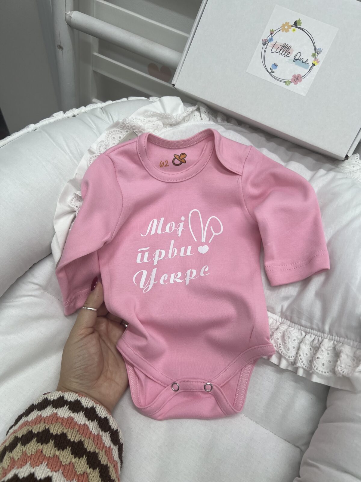Roze bodić sa natpisom Moj prvi Uskrs-Bodić
