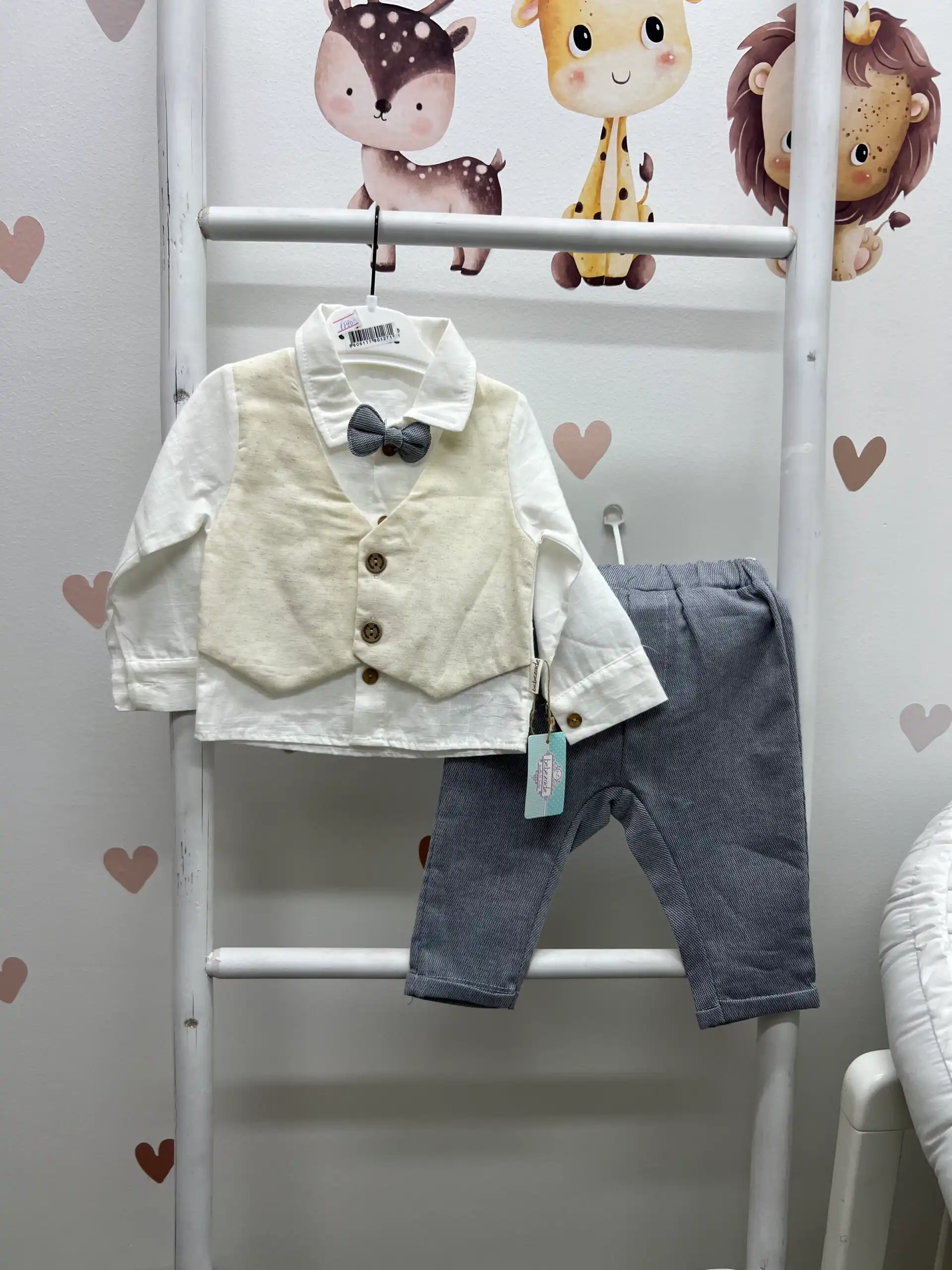 Elegantna košulja sa našivenim prslukom daje kompletu sofisticiran i uredan izgled, dok se leptir mašna lako skida po potrebi. Pantalone su udobne i lepo krojene, tako da mališan izgleda svečano, a da mu je istovremeno prijatno tokom nošenja.
