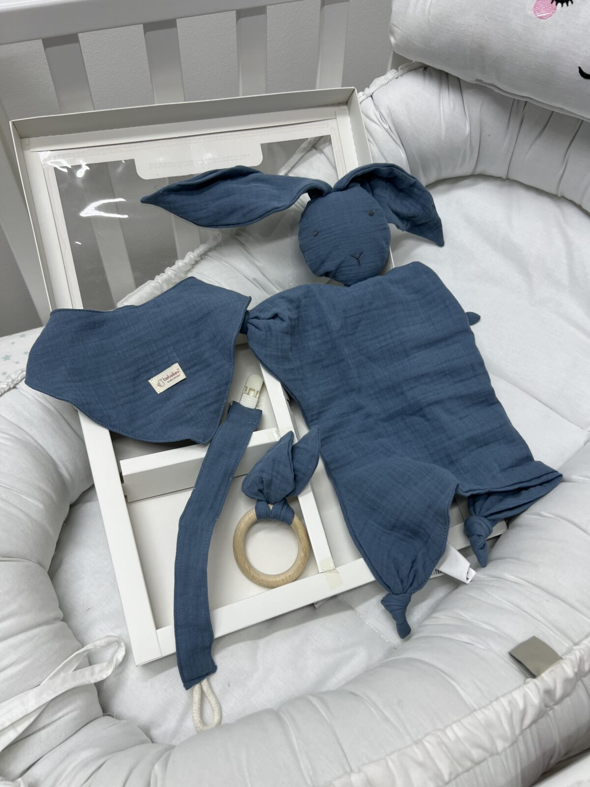 Set za bebe koji uključuje mazilicu, glodalicu, maramu, portiklu i vezicu za dudu, sve ručno šiveno od duple gaze, 100% pamuk