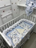 Set se sastoji od pletenice za tri strane krevetića koja pruža dodatnu zaštitu, dušek čaršafa sa elastičnom trakom za savršeno prijanjanje, mekanog prekrivača i ravnog jastučića. Svaki element pažljivo je izrađen kako bi obezbedio udobnost, praktičnost i dugotrajnu upotrebu.