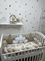 Ovaj prelepi set pruža udobnost i sigurnost vašoj bebi tokom sna. Na dužoj strani nalaze se dva jastuka u obliku zvezde ⭐⭐, a između njih oblačak . Sva tri jastuka imaju vezice za sigurno pričvršćivanje.