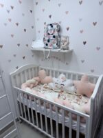 Ovaj prelepi set pruža udobnost i sigurnost vašoj bebi tokom sna. Na dužoj strani nalaze se dva jastuka: u obliku zvezde ⭐ i srca, a između njih oblačak sa kapicom ☁️🎀. Sva tri jastuka imaju vezice za sigurno pričvršćivanje.