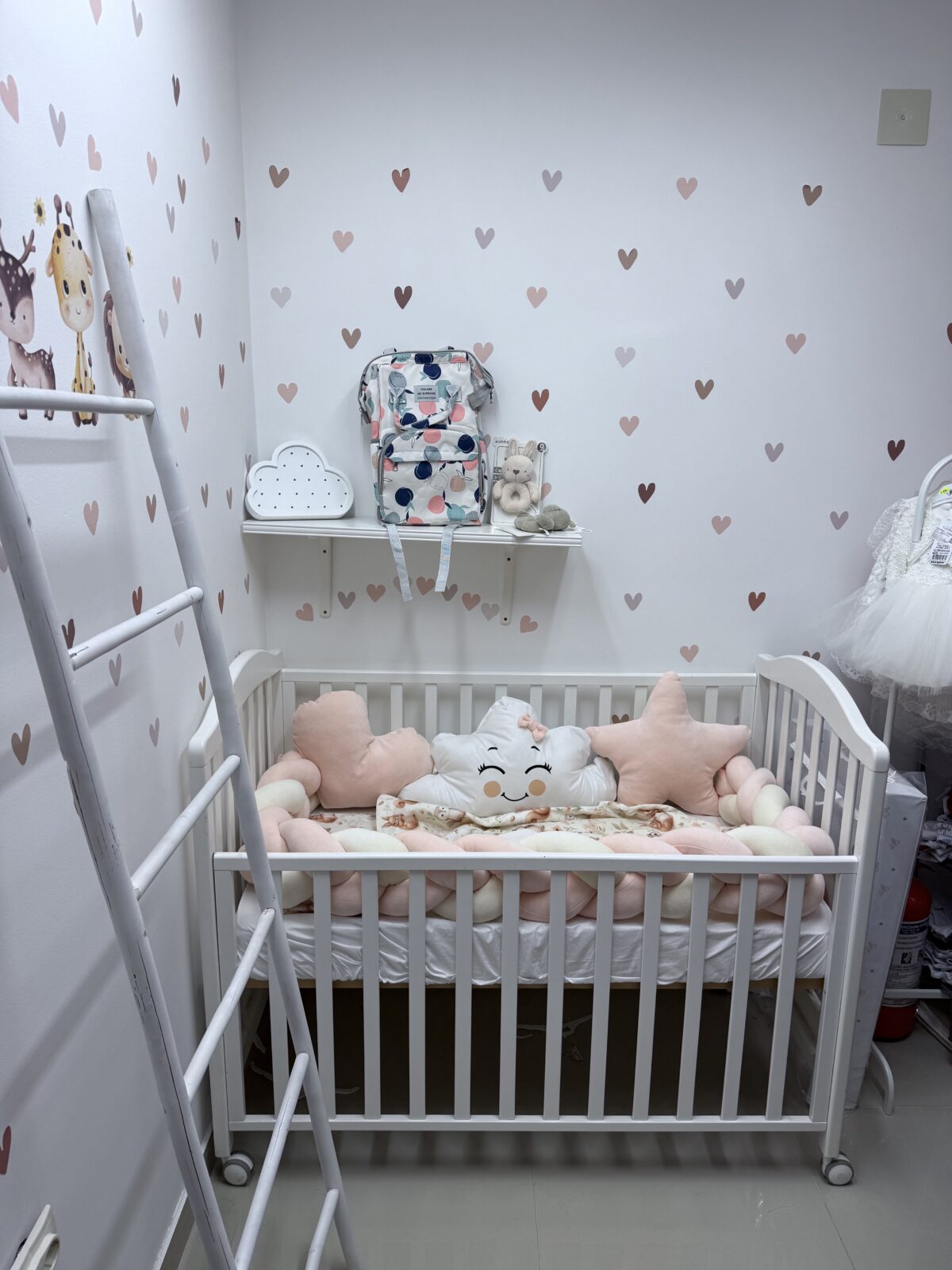 Ovaj prelepi set pruža udobnost i sigurnost vašoj bebi tokom sna. Na dužoj strani nalaze se dva jastuka: u obliku zvezde ⭐ i srca, a između njih oblačak sa kapicom ☁️🎀. Sva tri jastuka imaju vezice za sigurno pričvršćivanje.