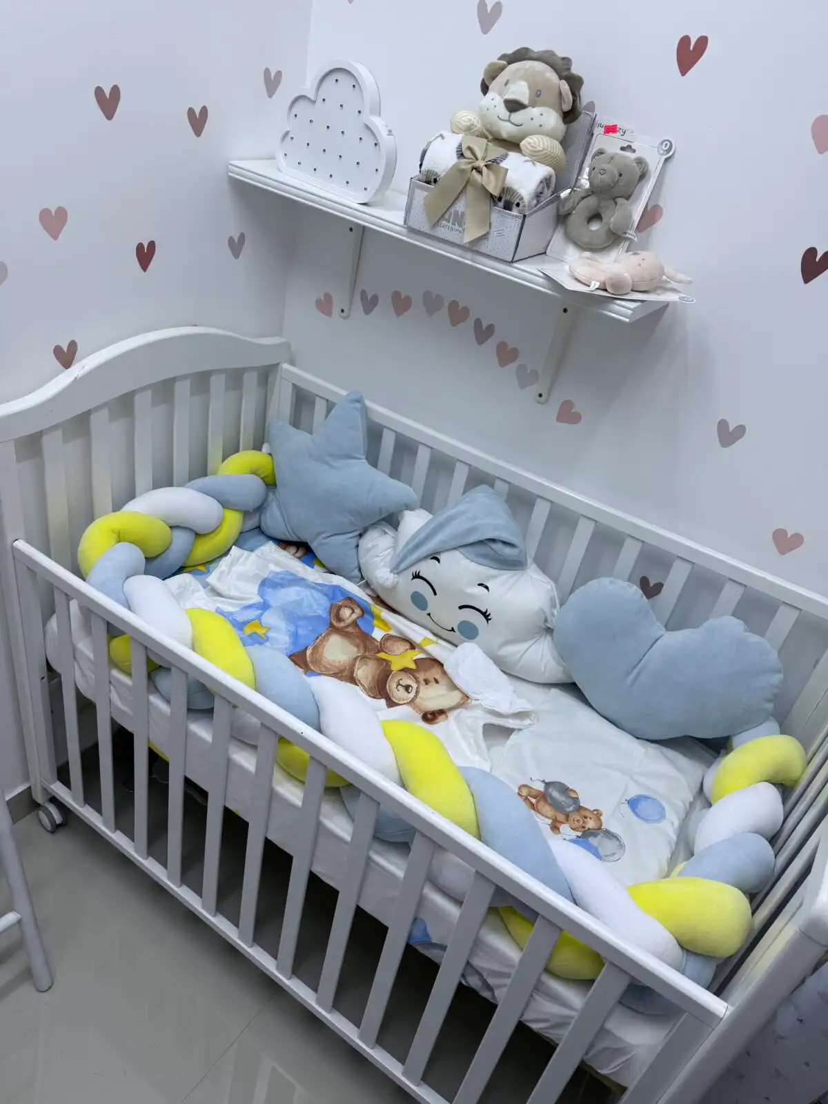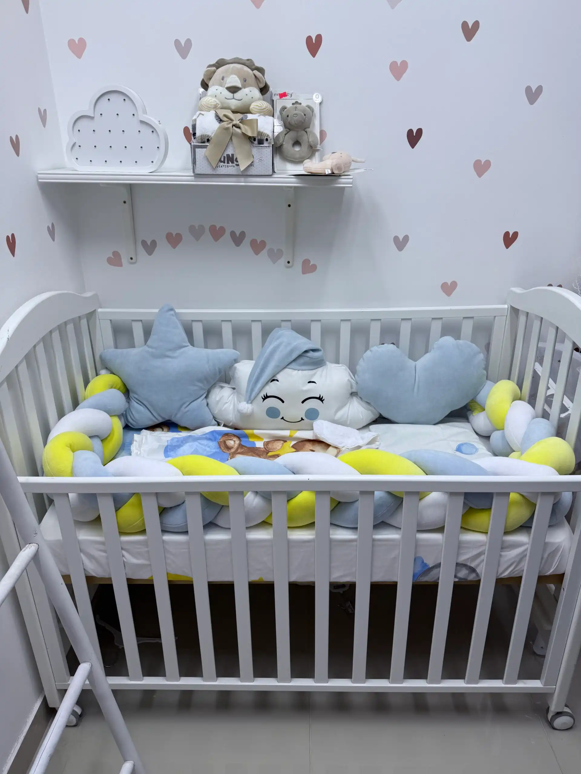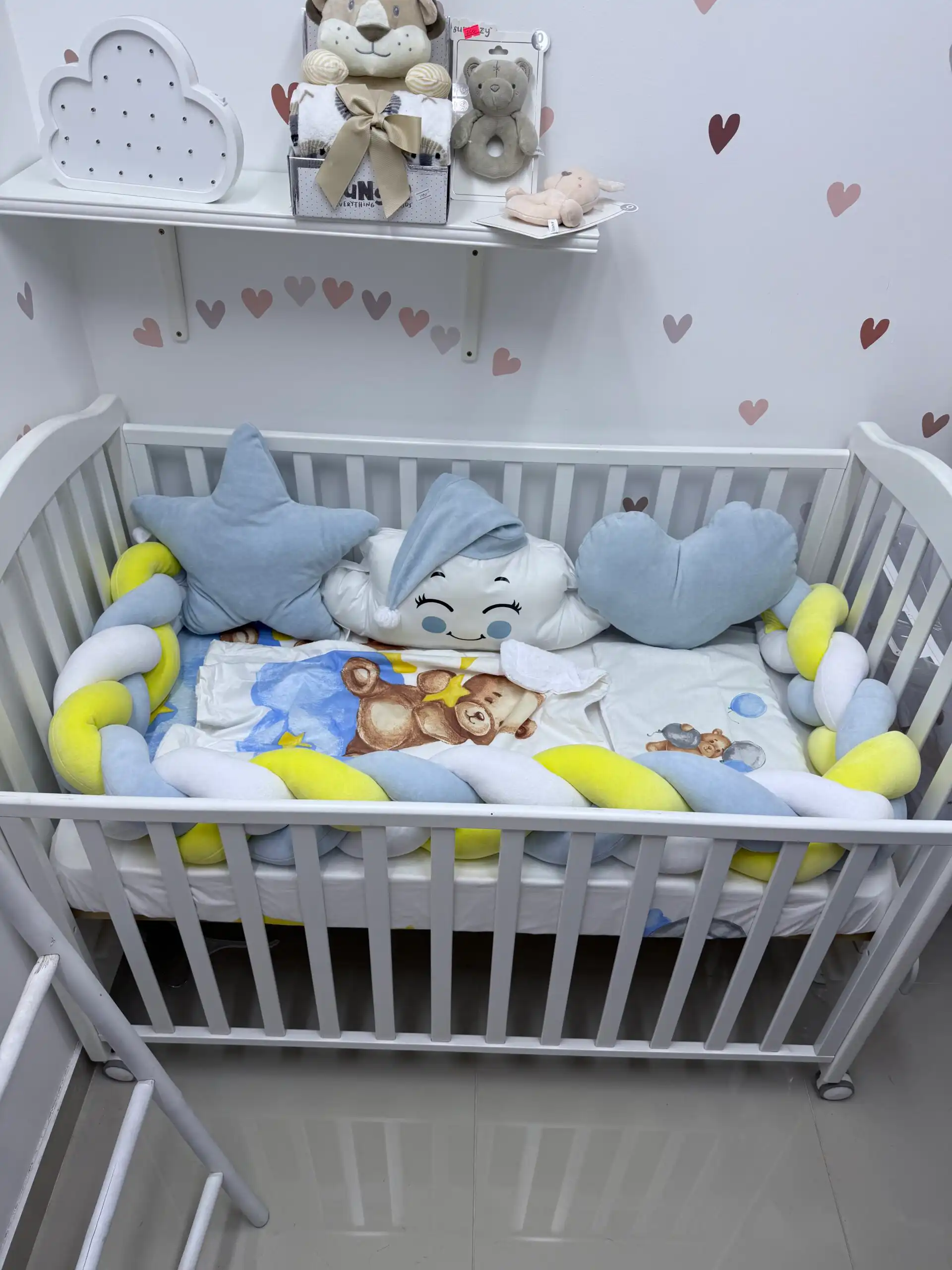 Ovaj prelepi set pruža udobnost i sigurnost vašoj bebi tokom sna. Na dužoj strani nalaze se dva jastuka: u obliku zvezde ili srca, a između njih oblačak sa kapicom ☁️🎀. Sva tri jastuka imaju vezice za sigurno pričvršćivanje.