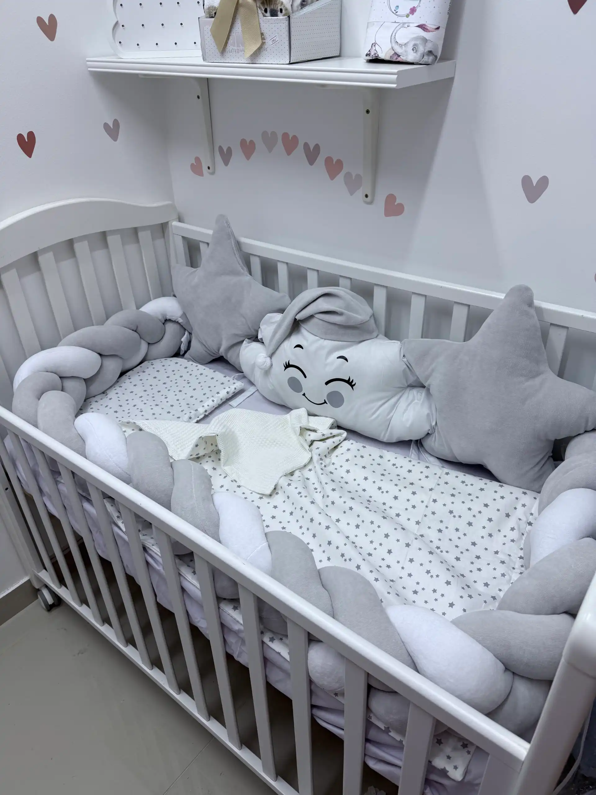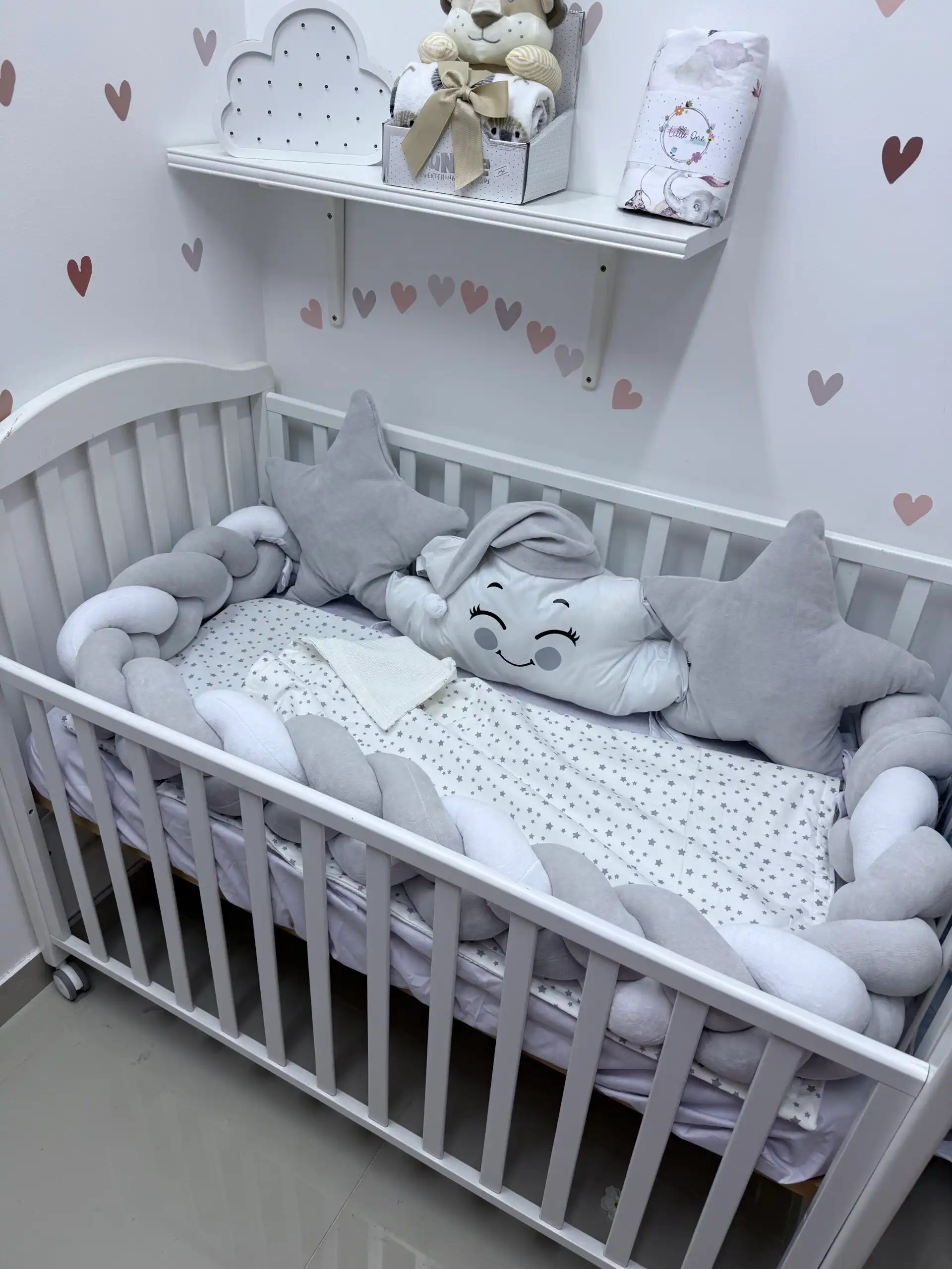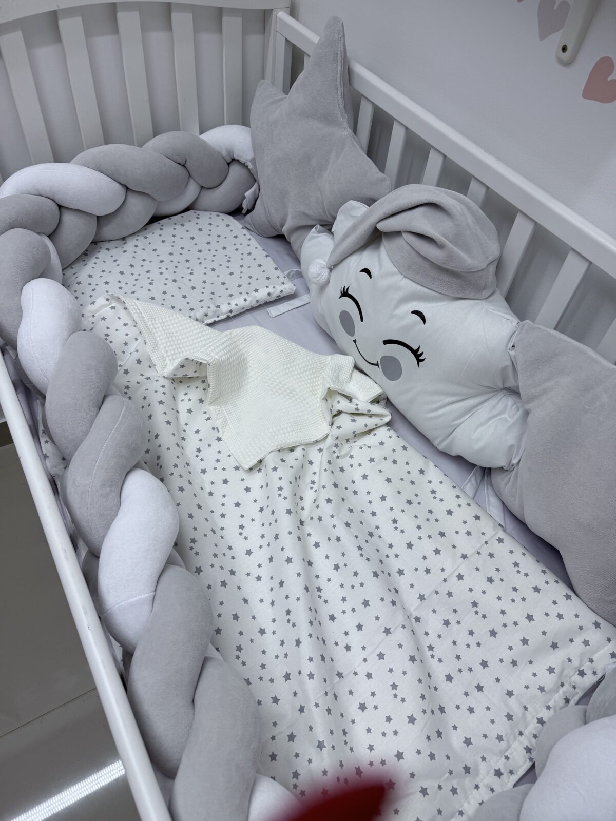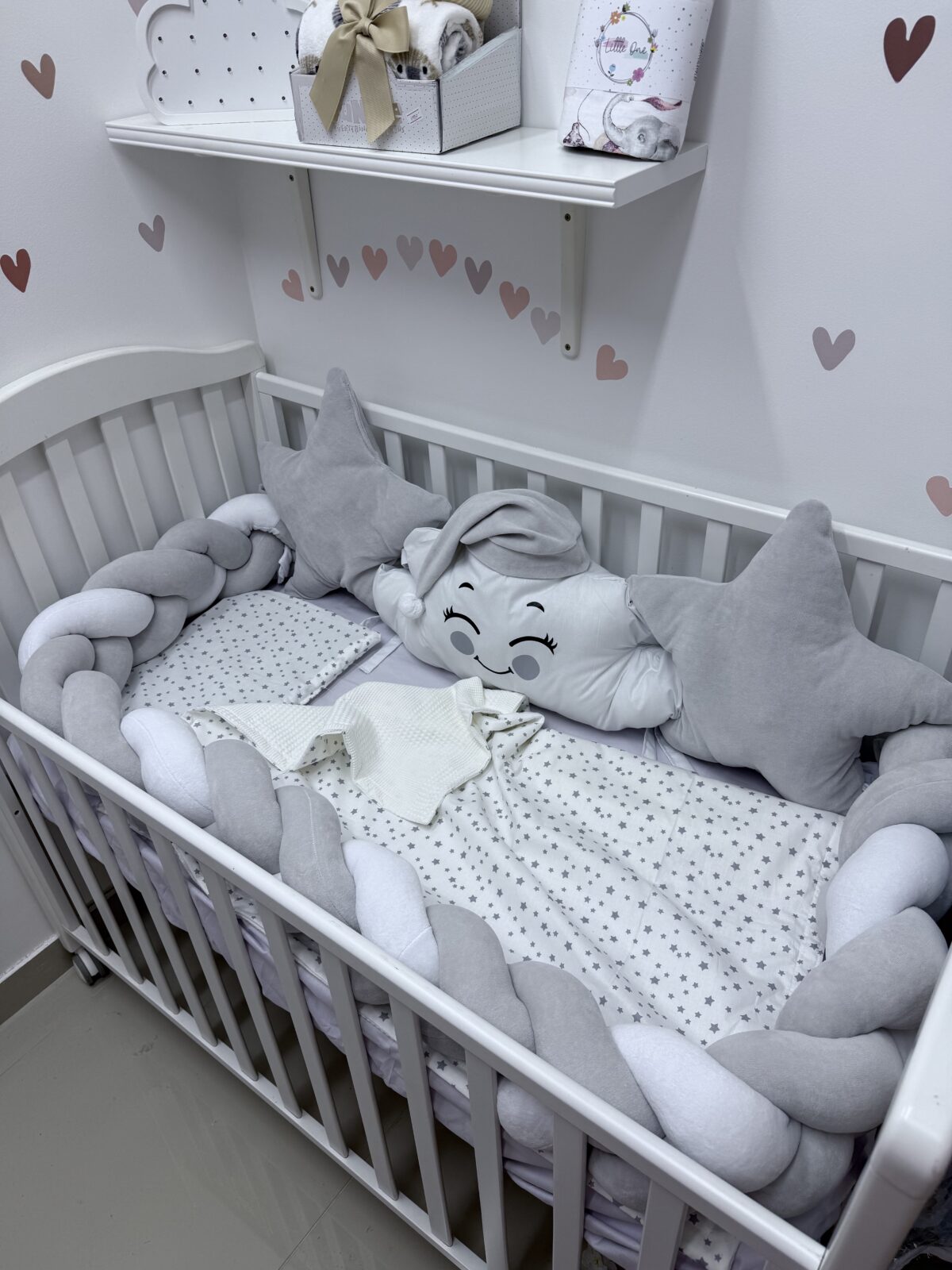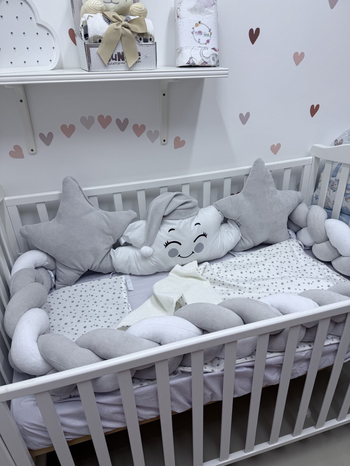Ovaj prelepi set pruža udobnost i sigurnost vašoj bebi tokom sna. Na dužoj strani nalaze se dva jastuka: u obliku zvezde ⭐ i srca, a između njih oblačak sa kapicom ☁️🎀. Sva tri jastuka imaju vezice za sigurno pričvršćivanje.