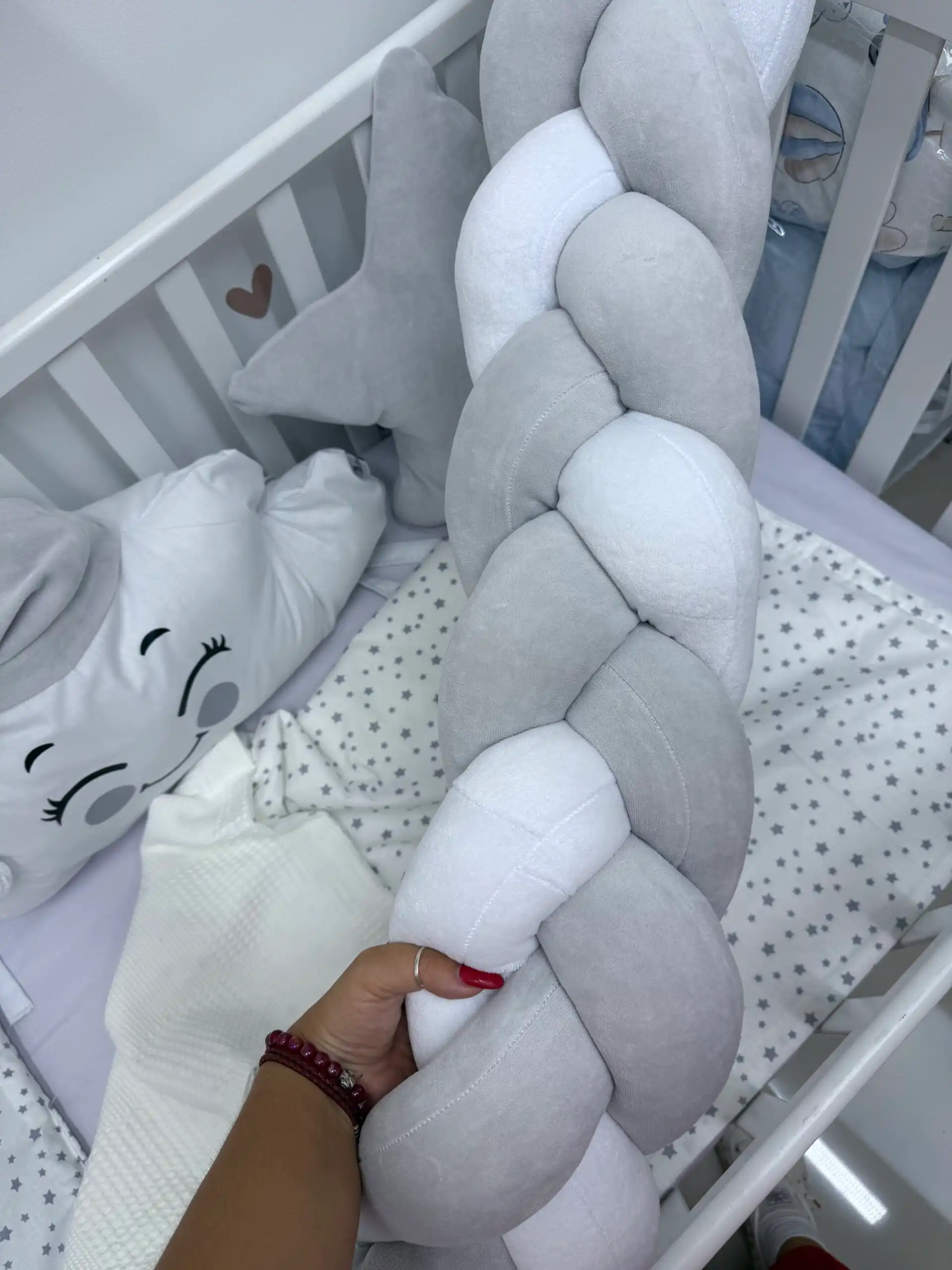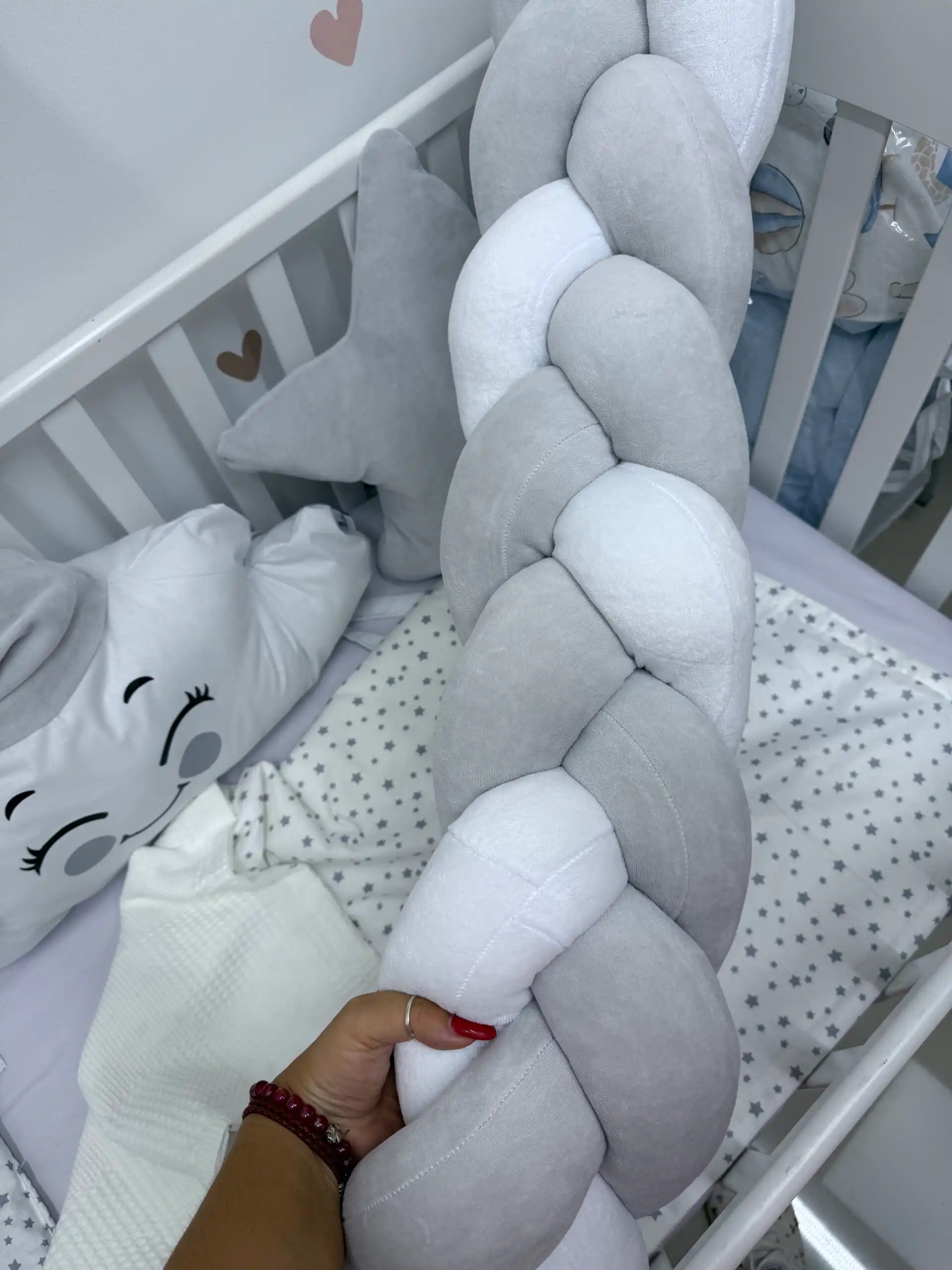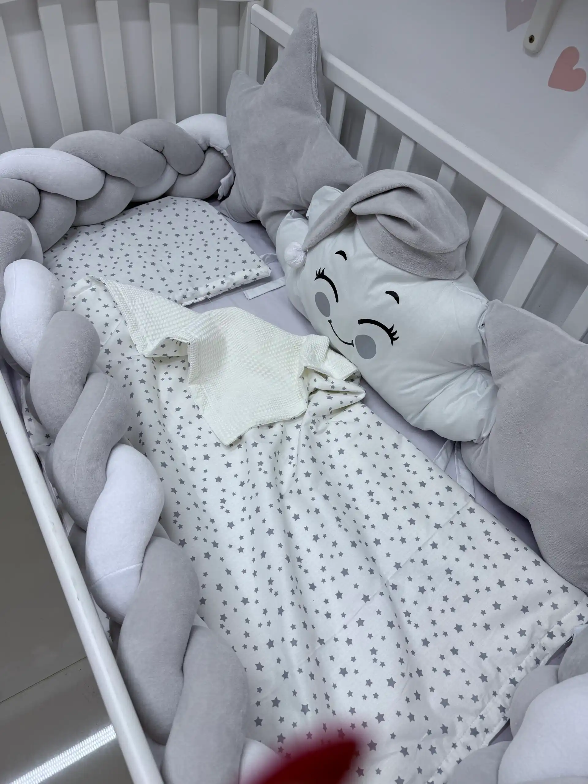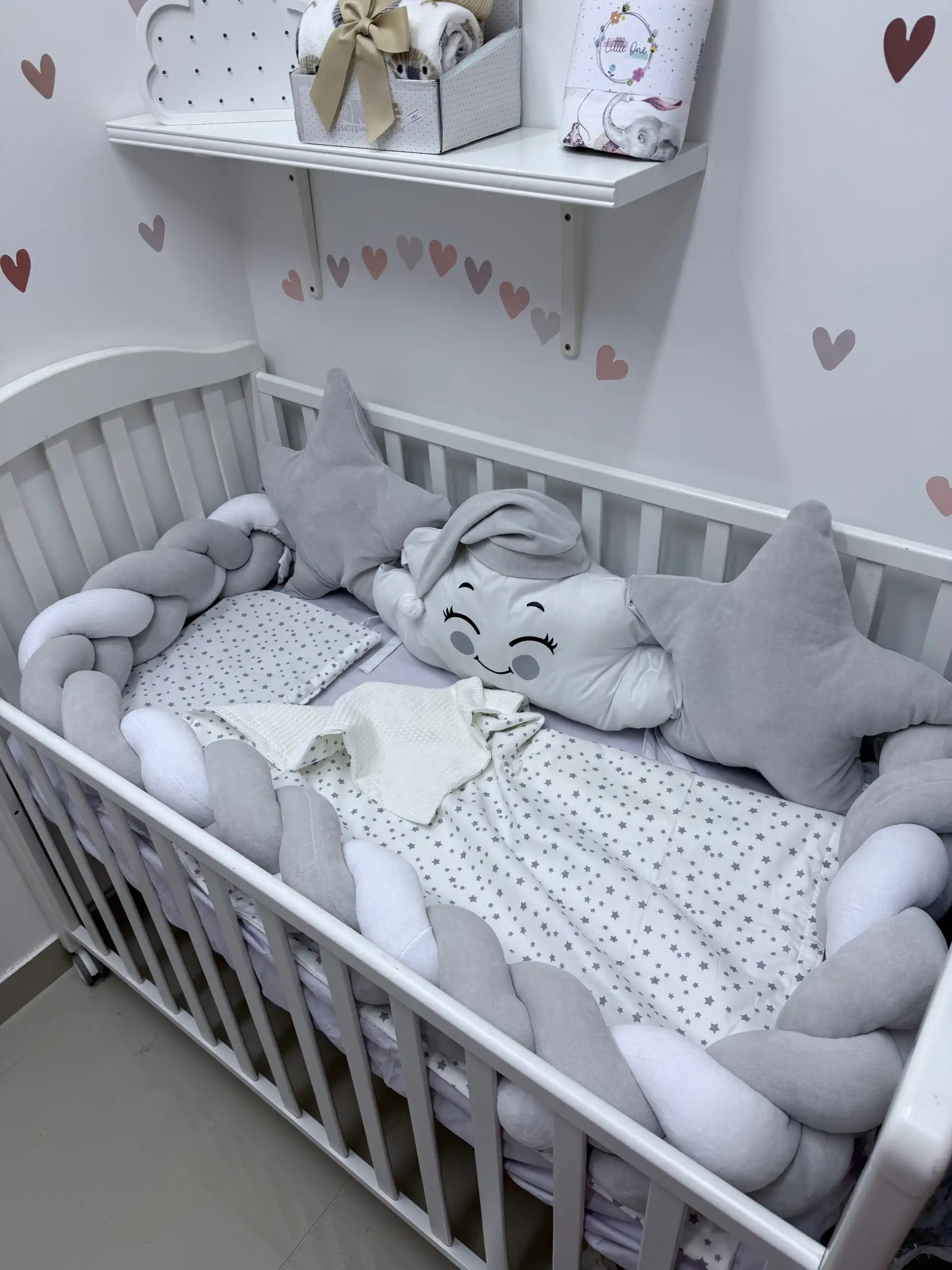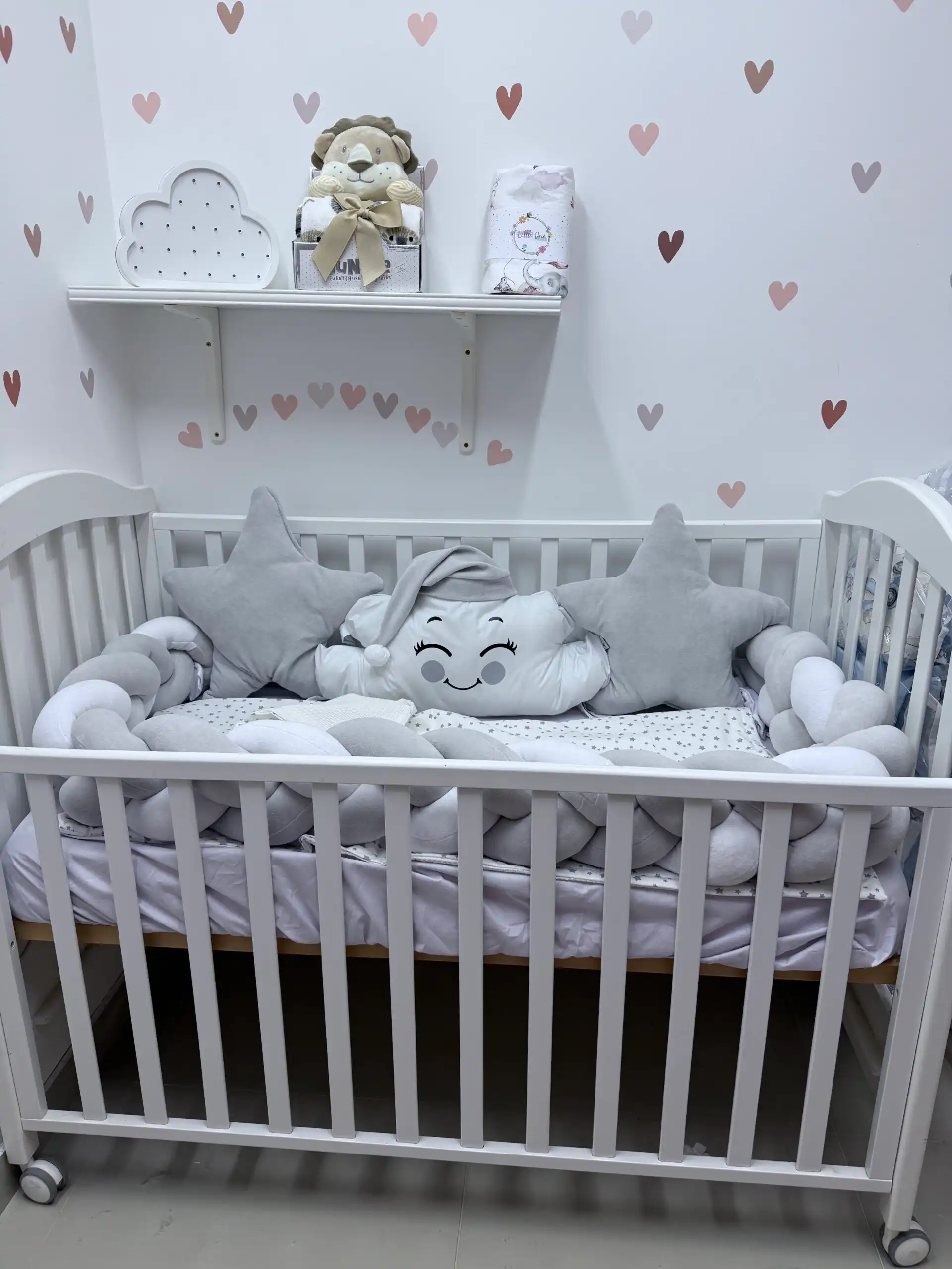 Ovaj prelepi set pruža udobnost i sigurnost vašoj bebi tokom sna. Na dužoj strani nalaze se dva jastuka: u obliku zvezde ⭐ i srca, a između njih oblačak sa kapicom ☁️🎀. Sva tri jastuka imaju vezice za sigurno pričvršćivanje.
