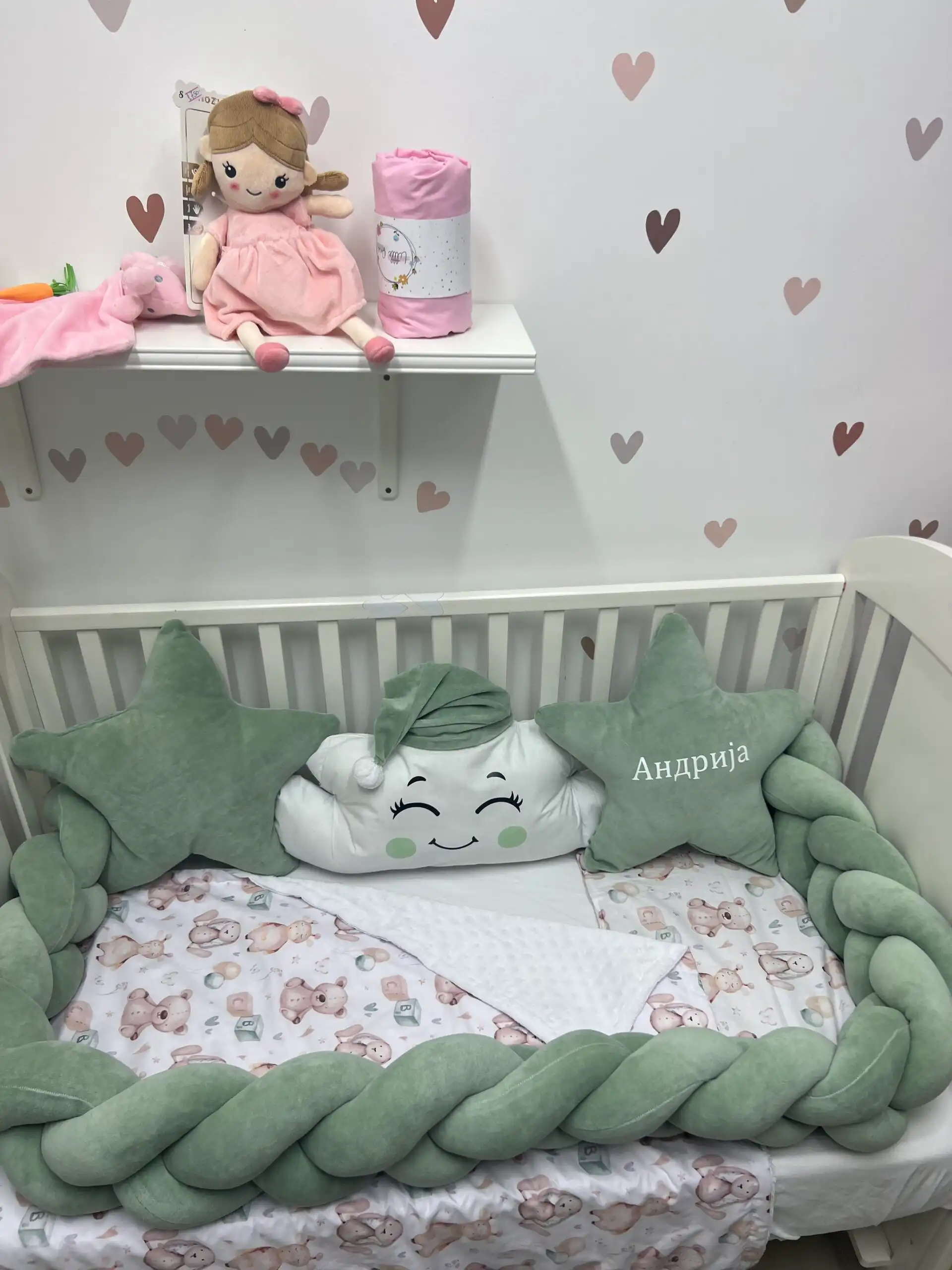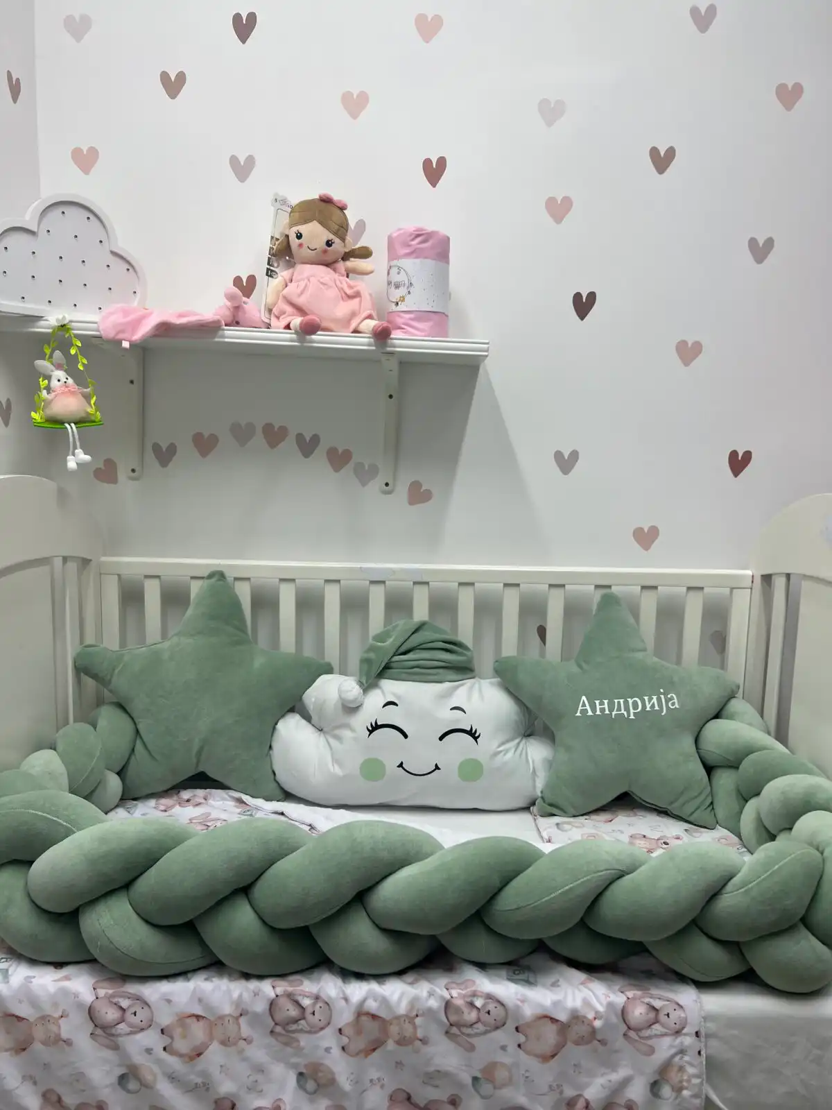 Ovaj prelepi set pruža udobnost i sigurnost vašoj bebi tokom sna. Na dužoj strani nalaze se dva jastuka u obliku zvezde ⭐i srca, a između njih oblačak sa kapicom ☁️. Sva tri jastuka imaju vezice za sigurno pričvršćivanje.