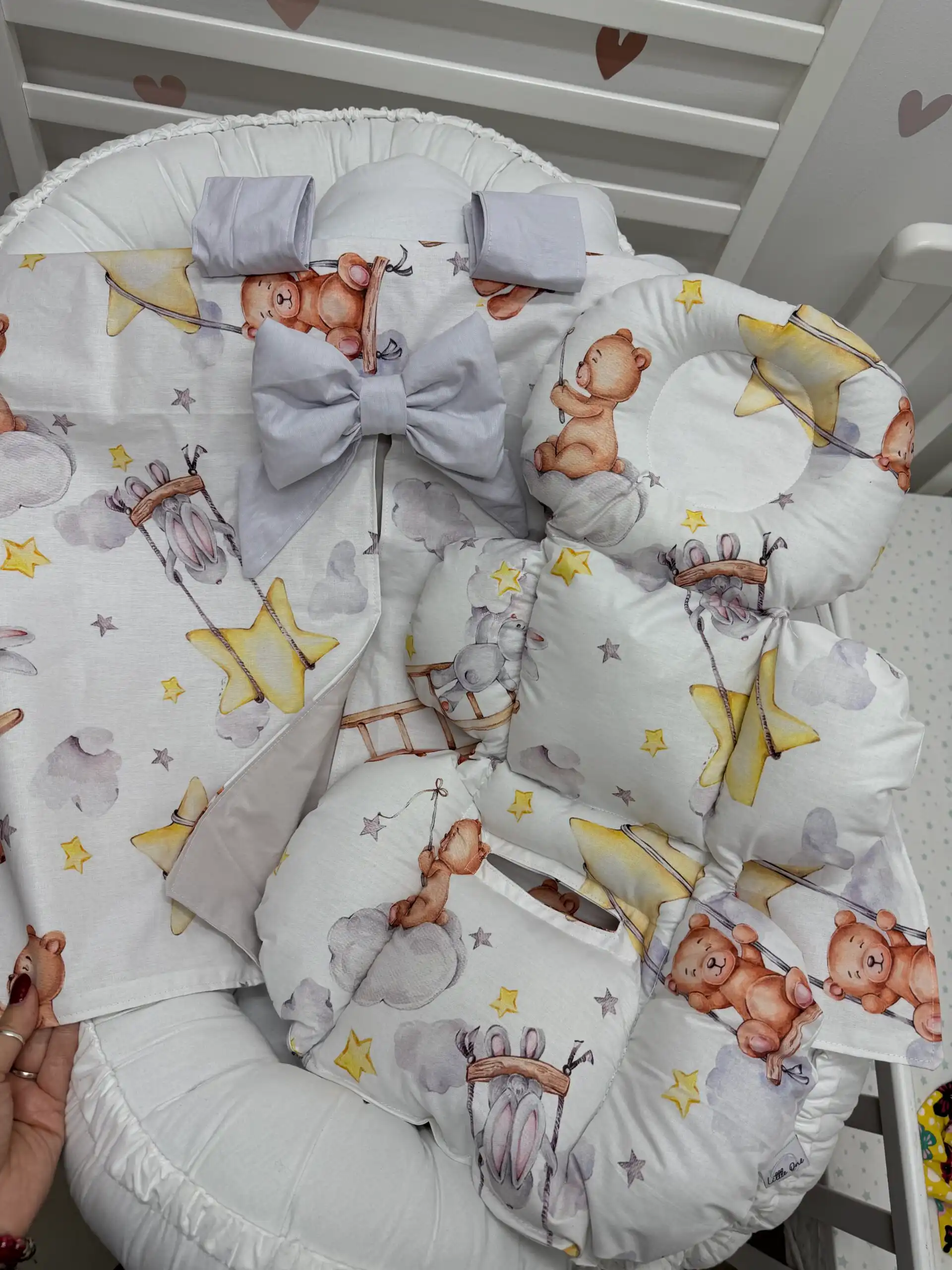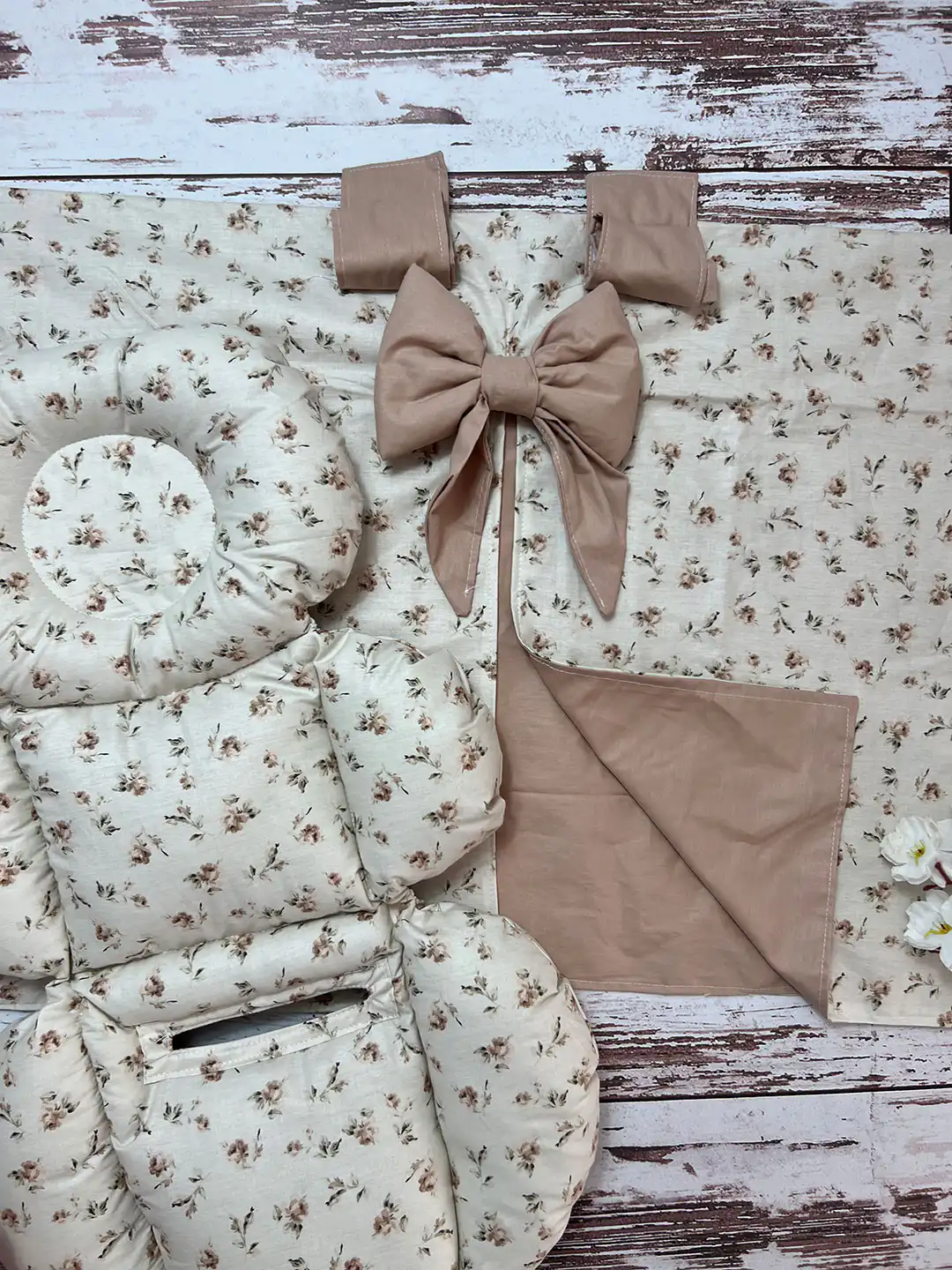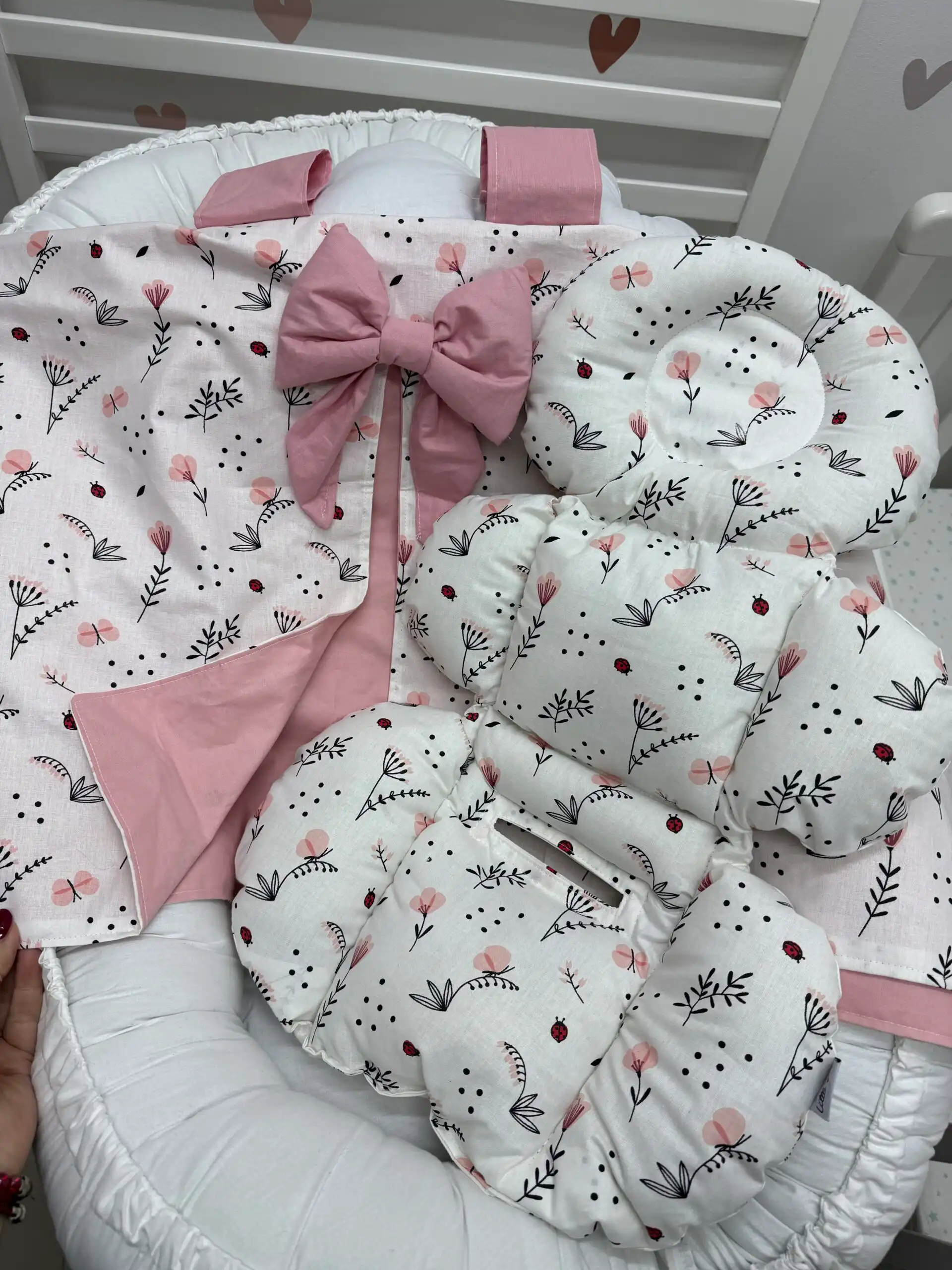 Ovaj set, koji sadrži prekrivač i jastuče, pruža bebi dodatnu toplinu, udobnost i zaštitu od spoljašnjih uticaja. Mekan, prozračan i praktičan, osmišljen je tako da bude i funkcionalan i estetski privlačan.