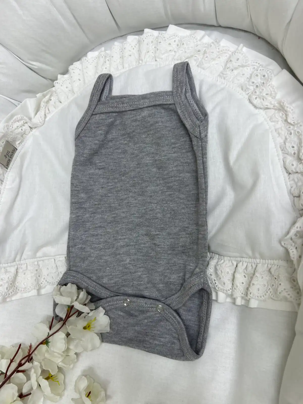 Pamučni bodić na tanke bretele izrađen od mekanog i prijatnog materijala koji je nežan prema bebinoj koži. Idealan za tople dane i svakodnevno nošenje. 👶