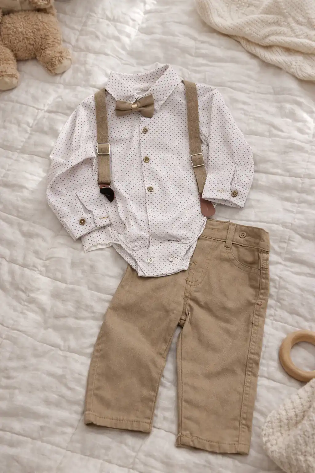 Presladak i elegantan komplet za najvažnije trenutke! Bodić u stilu košulje pruža uredan i svečan izgled, dok je istovremeno praktičan i udoban za nošenje. Leptir mašna i tregeri daju poseban šarm i pravi mali gospodski stil, a pantalone upotpunjuju kompletnu kombinaciju.