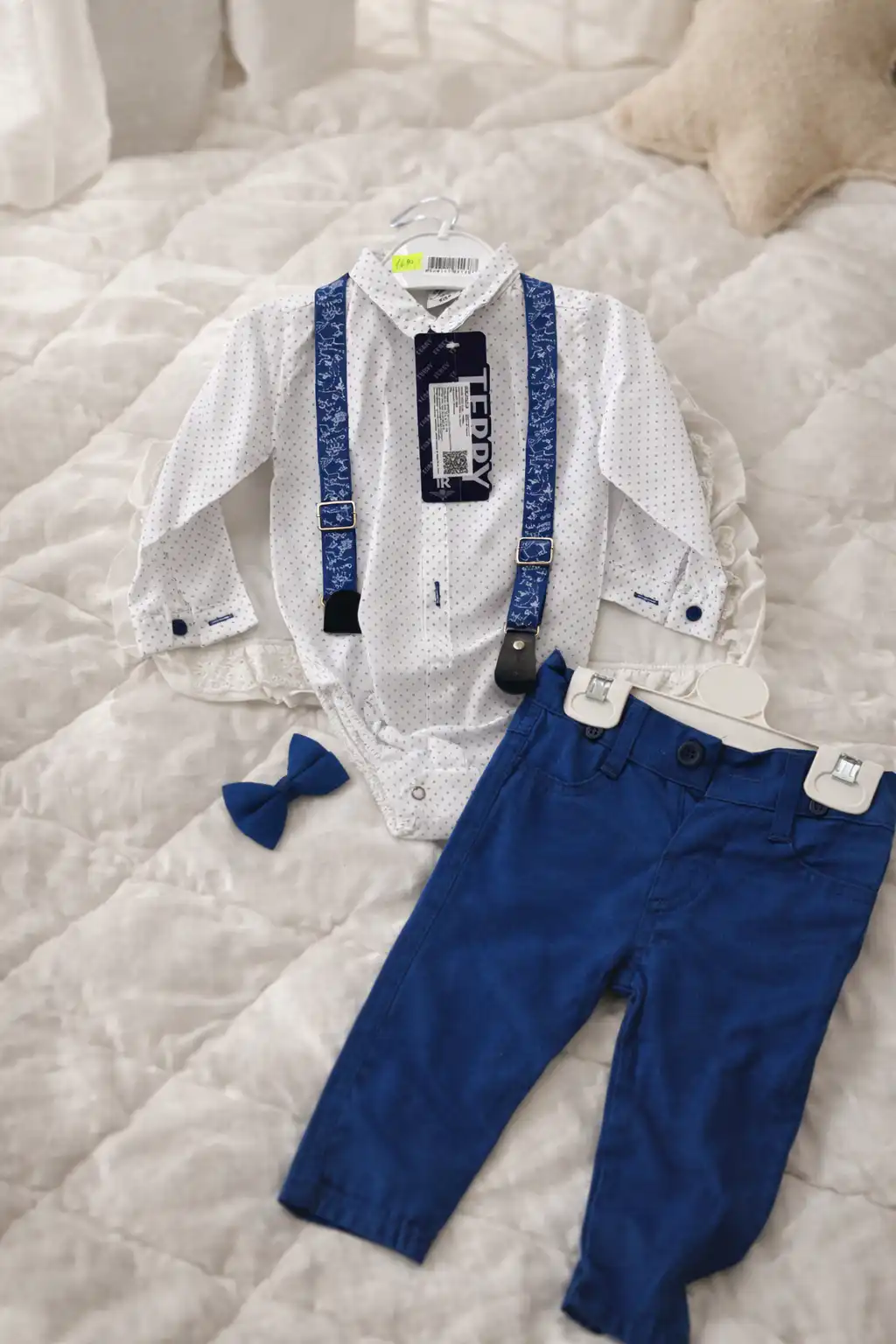 Presladak i elegantan komplet za najvažnije trenutke! Bodić u stilu košulje pruža uredan i svečan izgled, dok je istovremeno praktičan i udoban za nošenje. Leptir mašna i tregeri daju poseban šarm i pravi mali gospodski stil, a pantalone upotpunjuju kompletnu kombinaciju.
