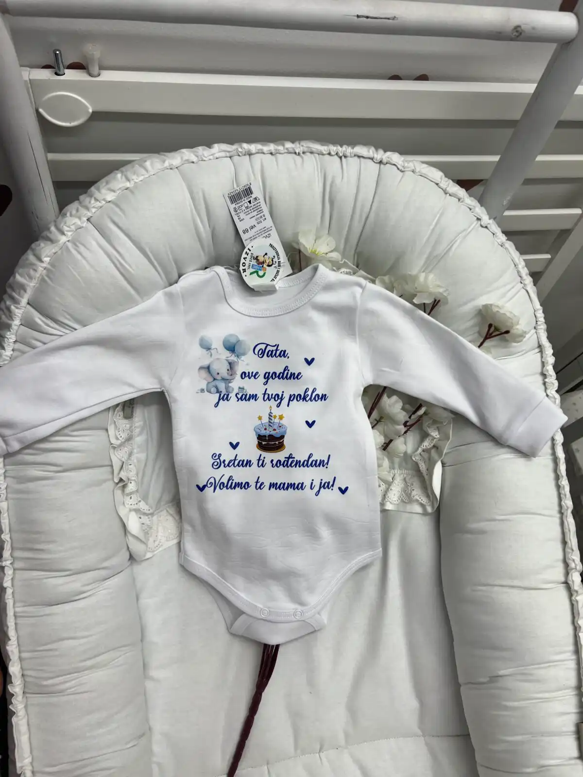 Ovaj bodić je savršen način da mališan obeleži tatin rođendan! S natpisom „Tata, ove godine sam ja tvoj poklon, srećan rođendan!“, uz simpatične ilustracije slonića i tortice, ovaj bodić donosi ljubav, zabavu i šarm u proslavu tatinog posebnog dana.