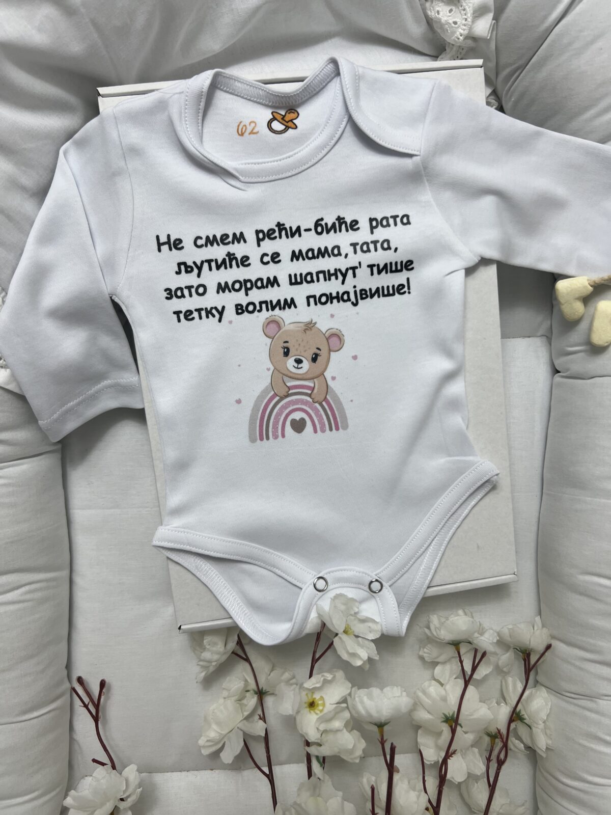 Predstavljamo vam preslatki bodić sa natpisom „Ne smem reći, biće rata, ljutiće se mama i tata, tetku volim ponajviše“ – savršen za sve male tetkine mezimce!