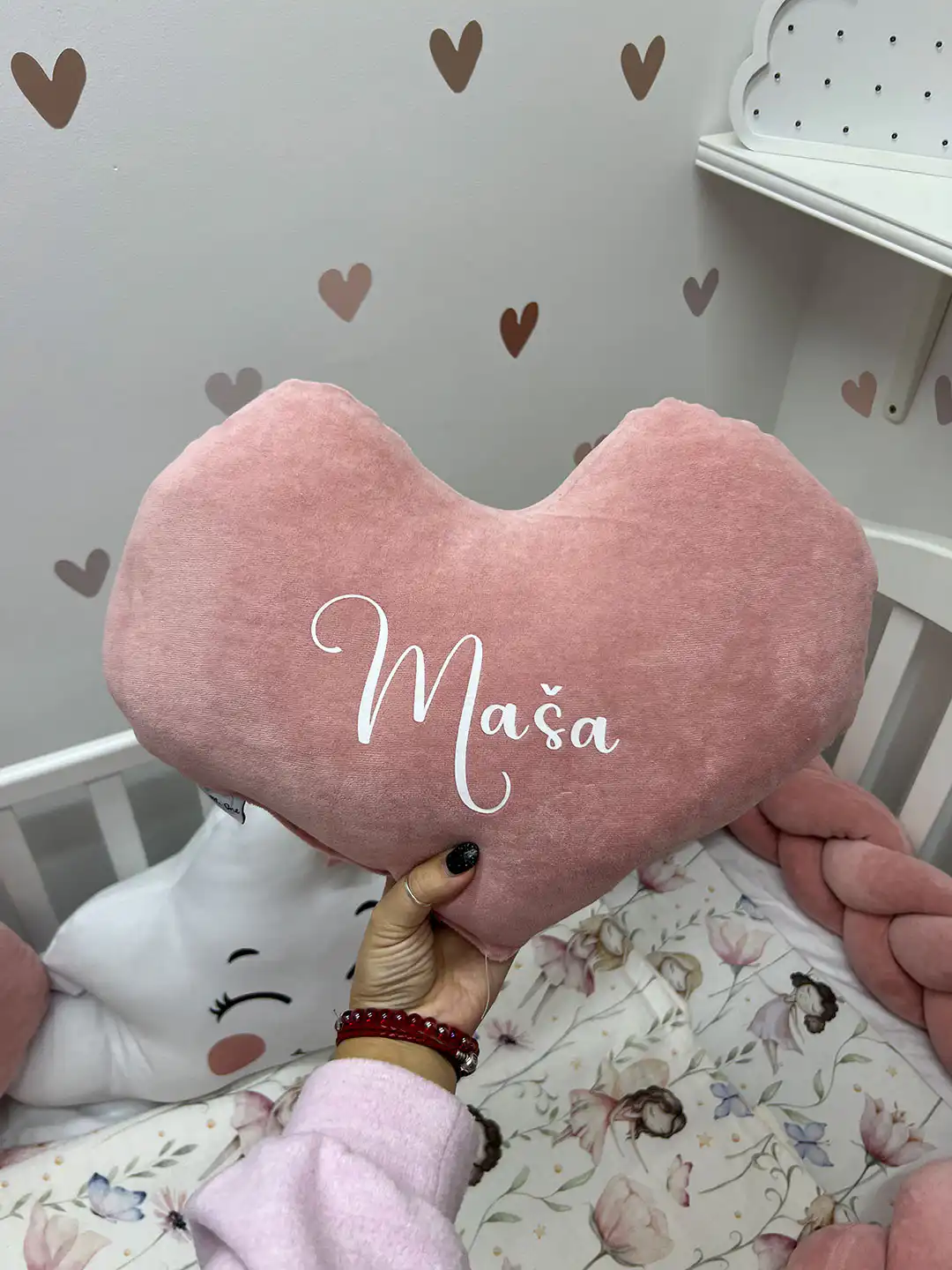 Ovaj prelepi ukrasni jastuk u obliku srca šiven je od nežnog bebi pliša, pružajući osećaj mekoće i topline. Savršen je kao dekoracija u sobi, ali i kao personalizovani poklon koji ostaje divna uspomena i kada mališan poraste.