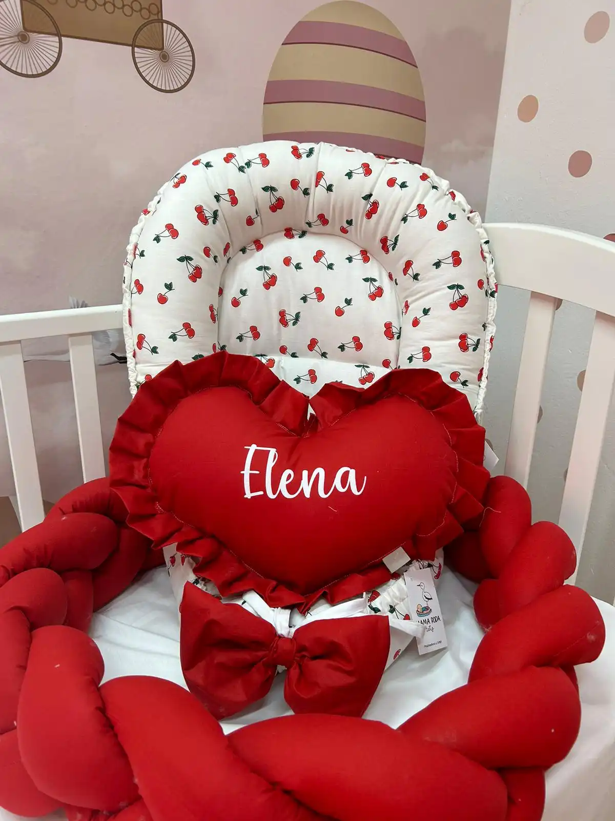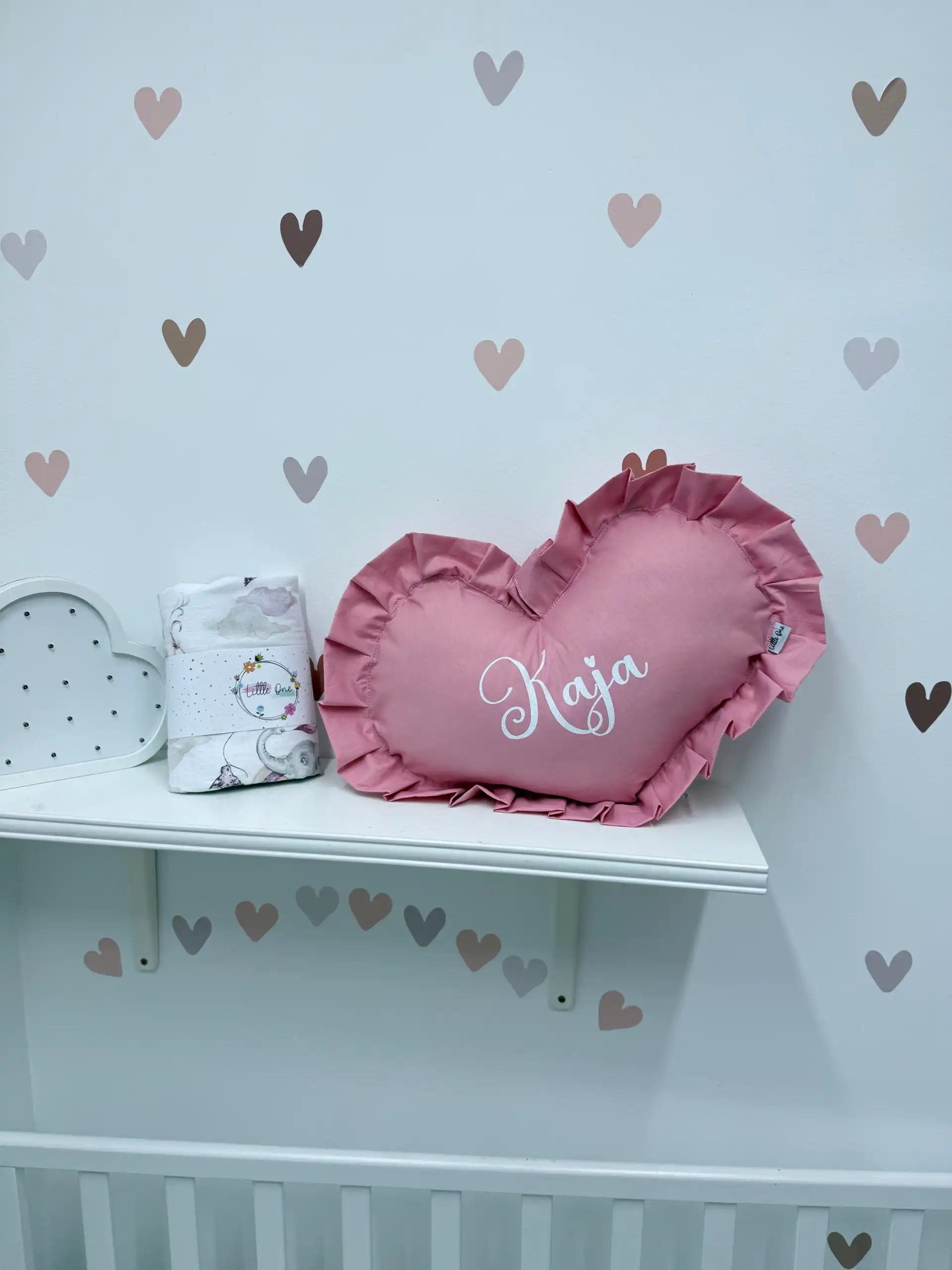 Personalizovano ukrasno jastuče u obliku srca sa karnerom nežan je detalj koji unosi toplinu i emociju u bebinu sobu. Mekano, dekorativno i pažljivo izrađeno, savršen je mali znak pažnje i uspomena koja ostaje zauvek 👶🎀💖