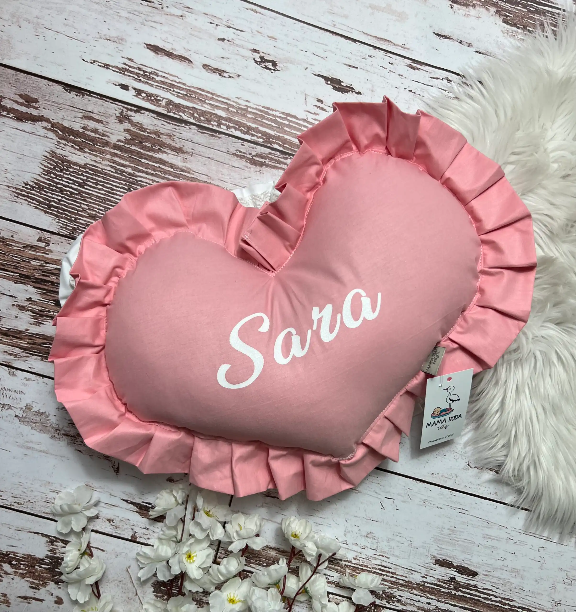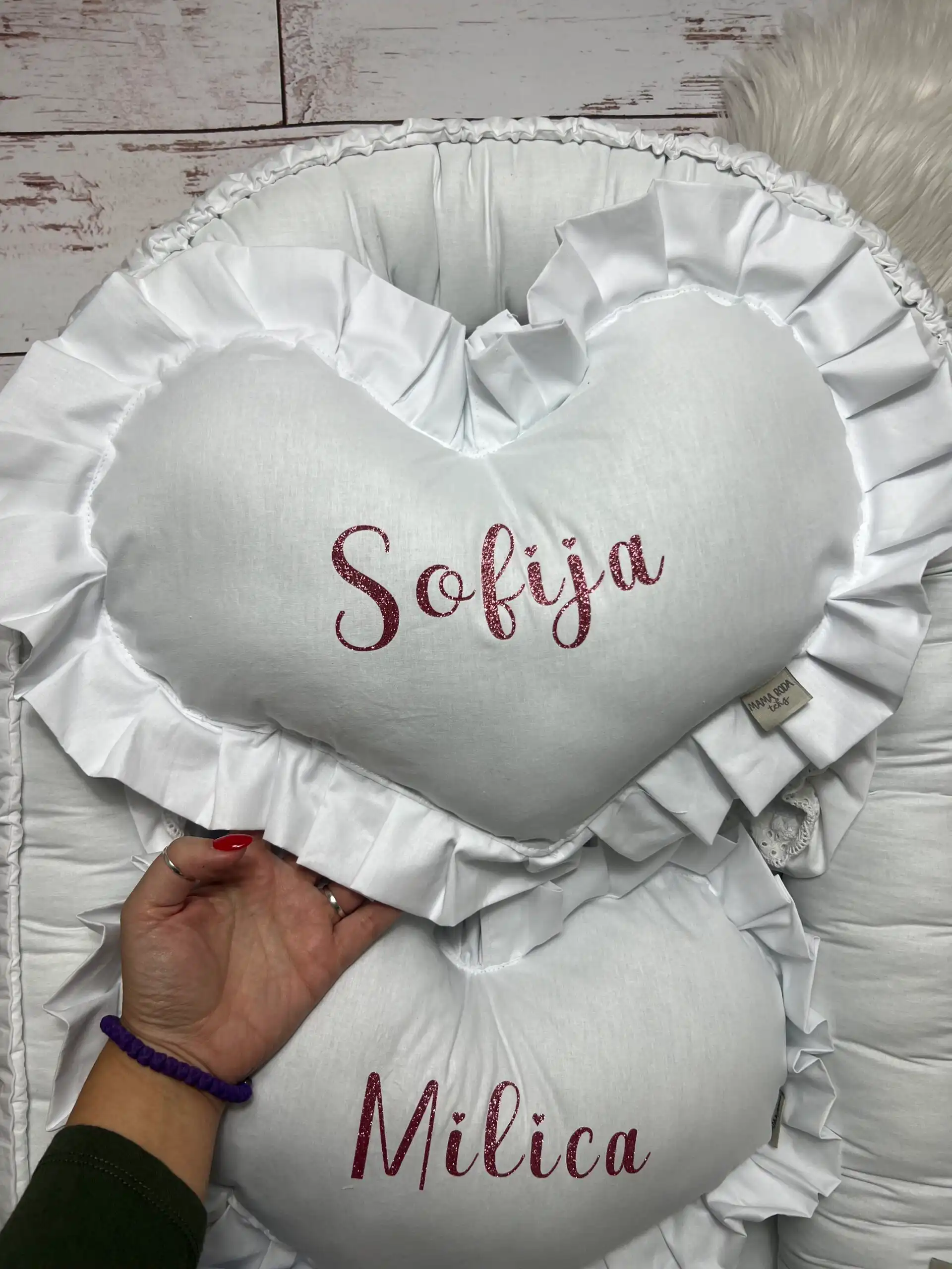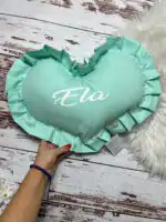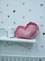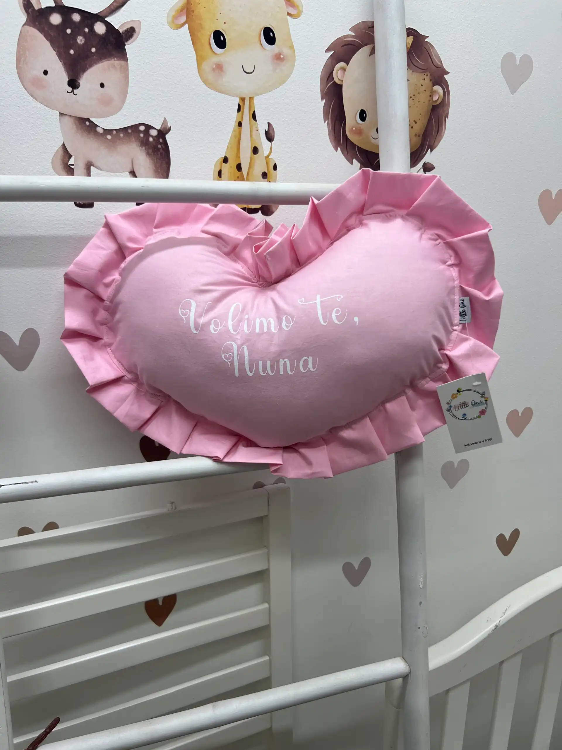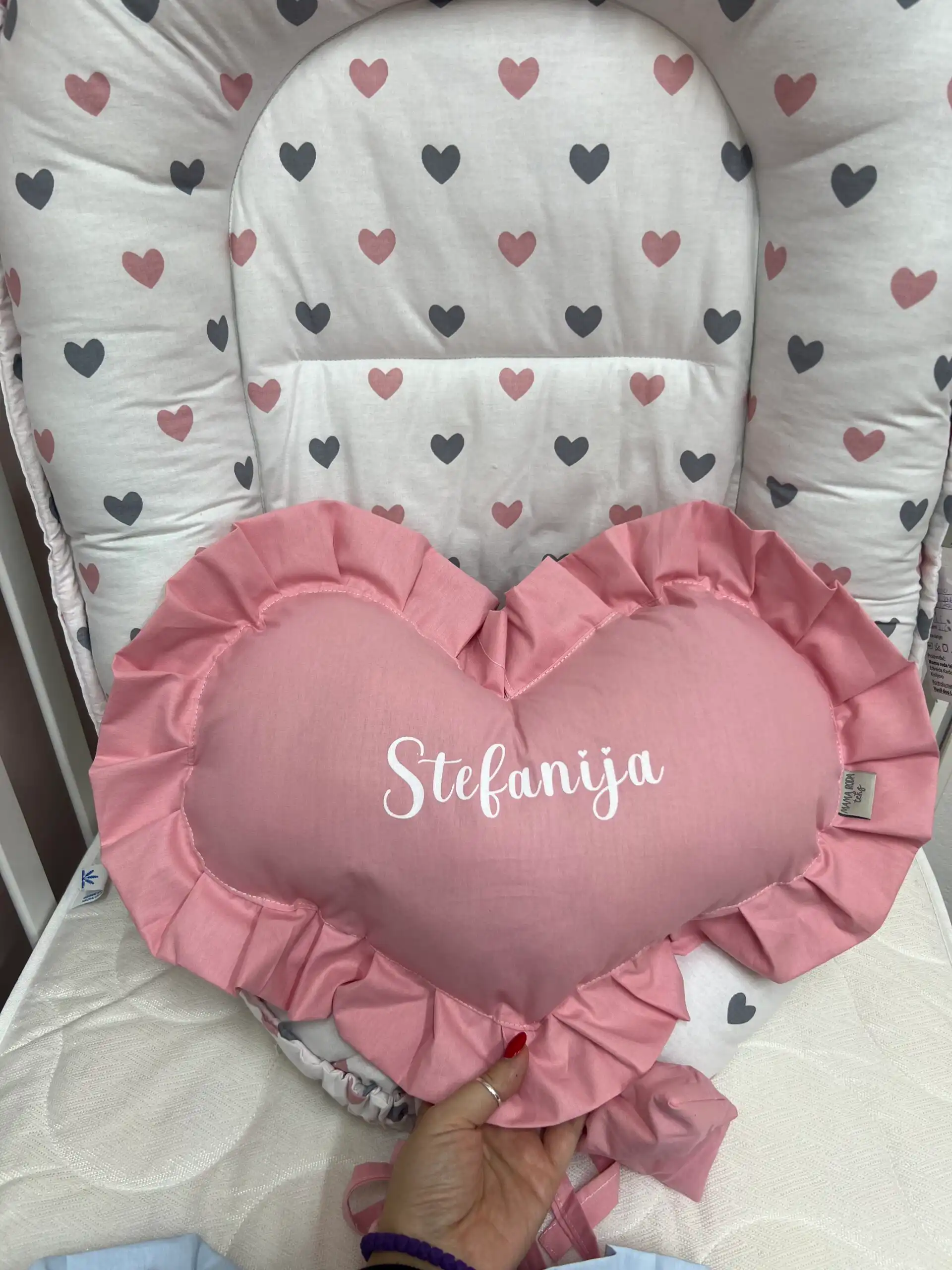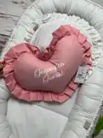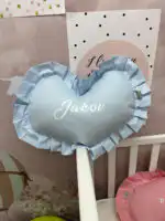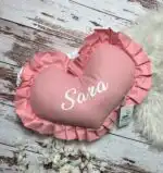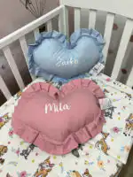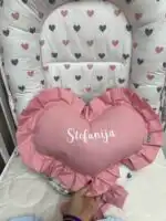 Personalizovano ukrasno jastuče u obliku srca sa karnerom, nežan detalj koji unosi toplinu i ljubav u svaki kutak 👶💗