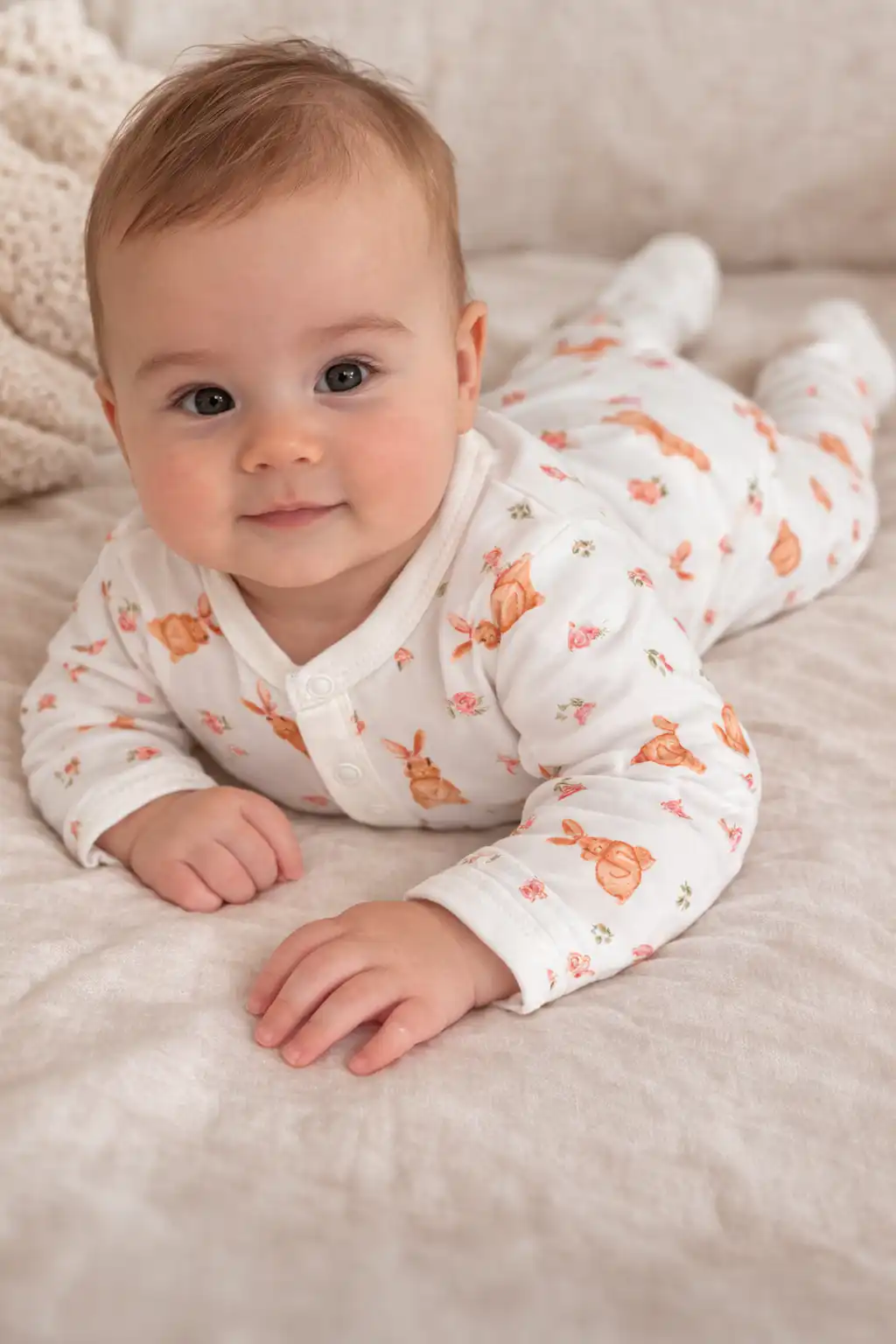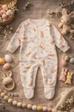 Romantična pamučna štramplica za bebe sa nežnim printom zeki i sitnih cvetića savršen je izbor za svakodnevno nošenje, spavanje ili šetnju. Izrađena od mekanog i prijatnog pamuka koji je nežan prema osetljivoj bebinoj koži i pruža maksimalnu udobnost tokom celog dana.
