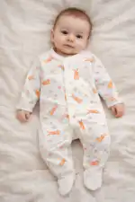Praktično kopčanje duž prednje strane omogućava brzo i lako presvlačenje, dok stopice dodatno greju bebina stopala. Neutralna svetla boja i presladak dezen čine ovu štramplicu idealnom za devojčice, ali i kao poklon za novorođenče.