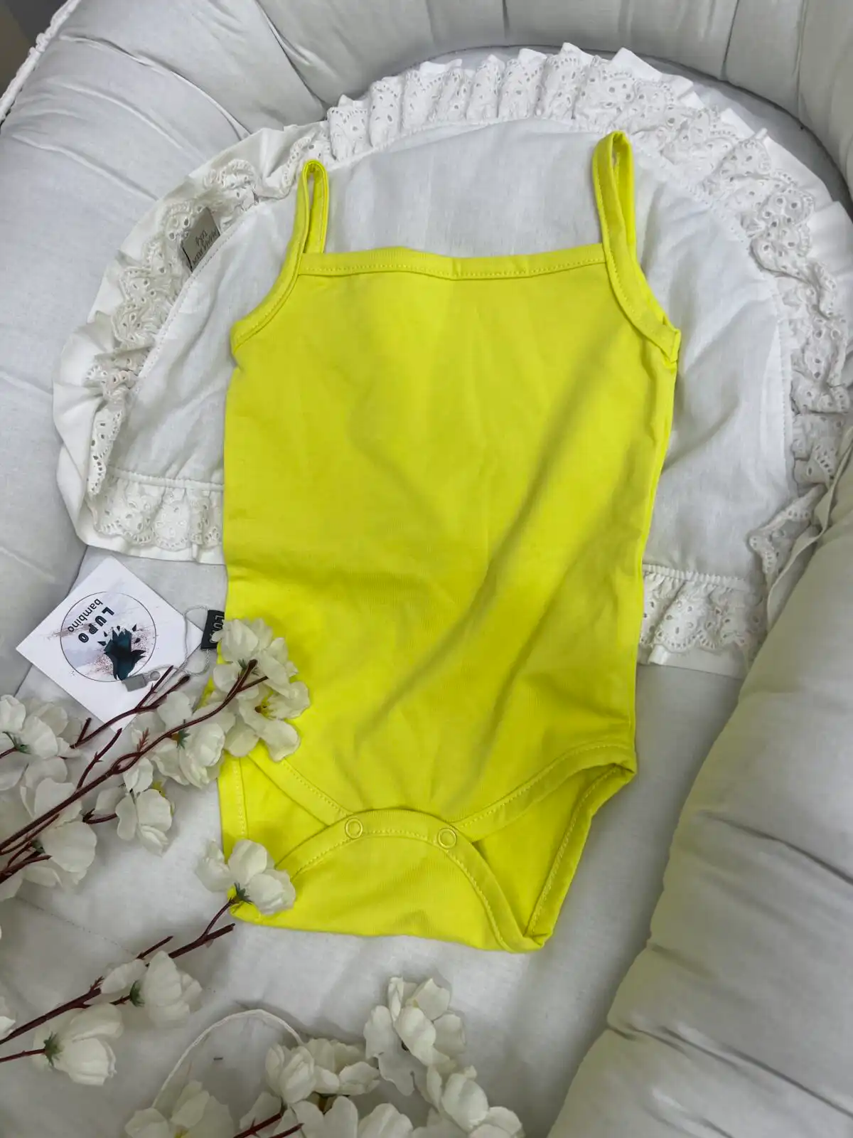 Pamučni bodić na tanke bretele izrađen od mekanog i prijatnog materijala koji je nežan prema bebinoj koži. Idealan za tople dane i svakodnevno nošenje. 👶